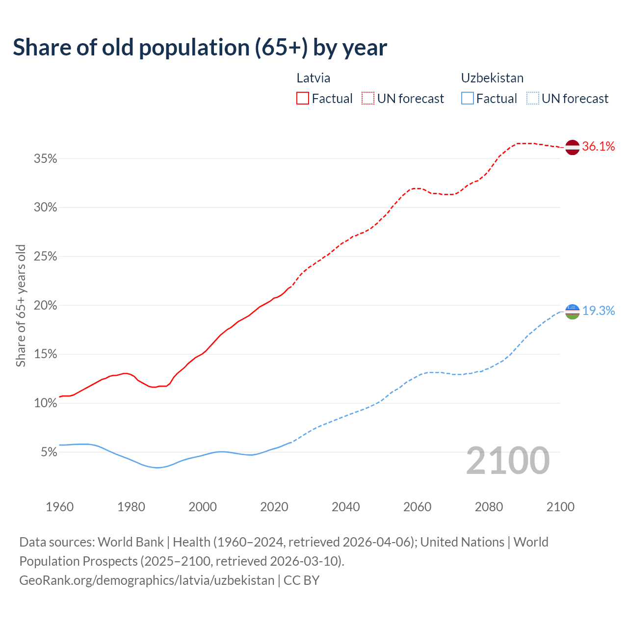 - The share of old-age demographic (65+) in Latvia is 21.7% vs 5.86% in Uzbekistan.
