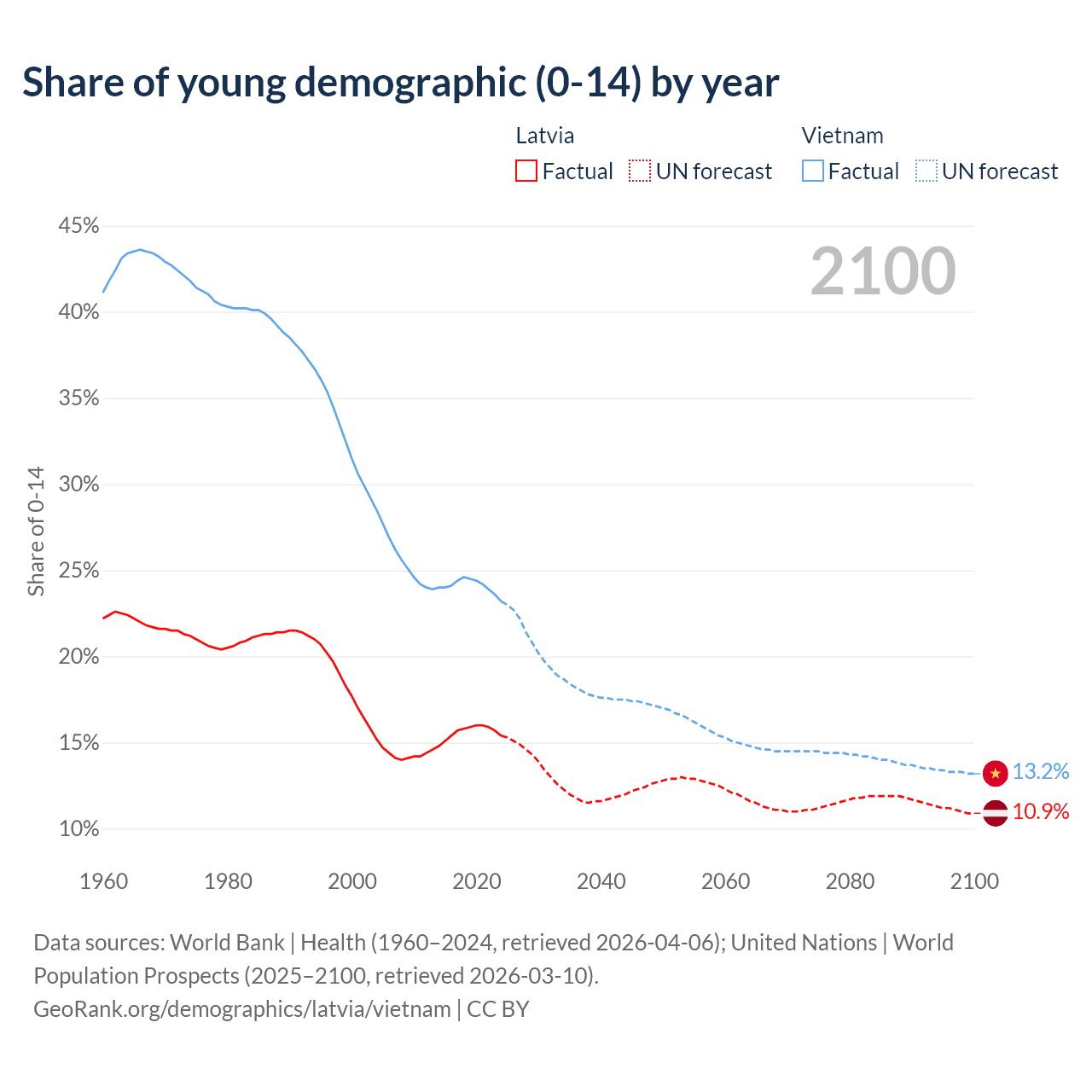 - The share of young demographic (0-15 years old) in Latvia is 15.4% vs 23.2% in Vietnam.