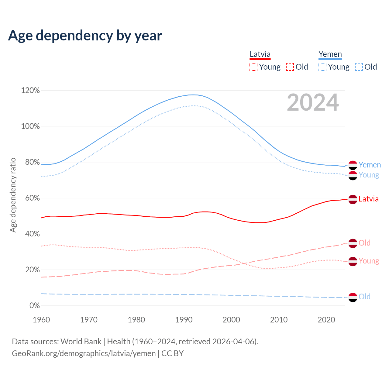- Latvia is ranked 20/196 by median age (oldest to youngest) vs 174/196 for Yemen.
