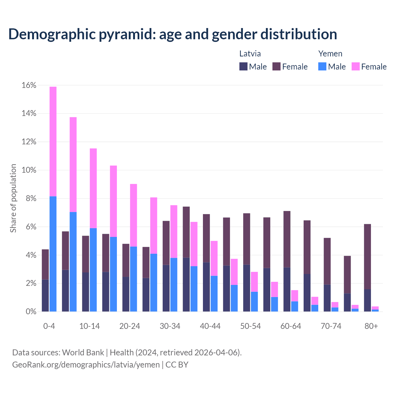 The share of older people aged 65 and over is 21.7% in Latvia and 2.52% in Yemen. Life expectancy in Latvia compared to Yemen .
