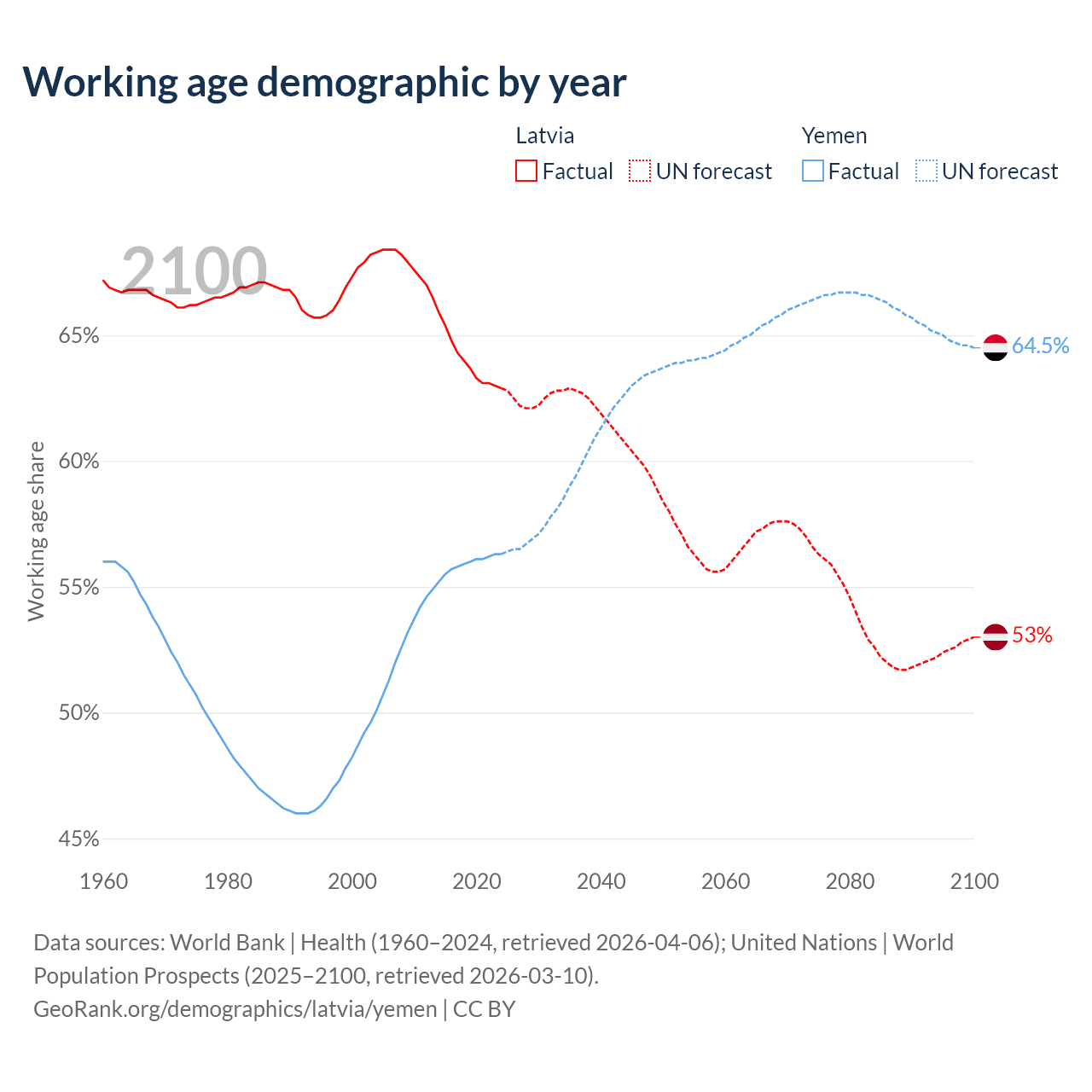 - Latvia has 1.15M working age adults (aged 15-64) vs 24.4M in Yemen.