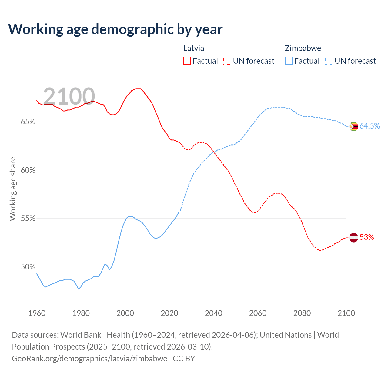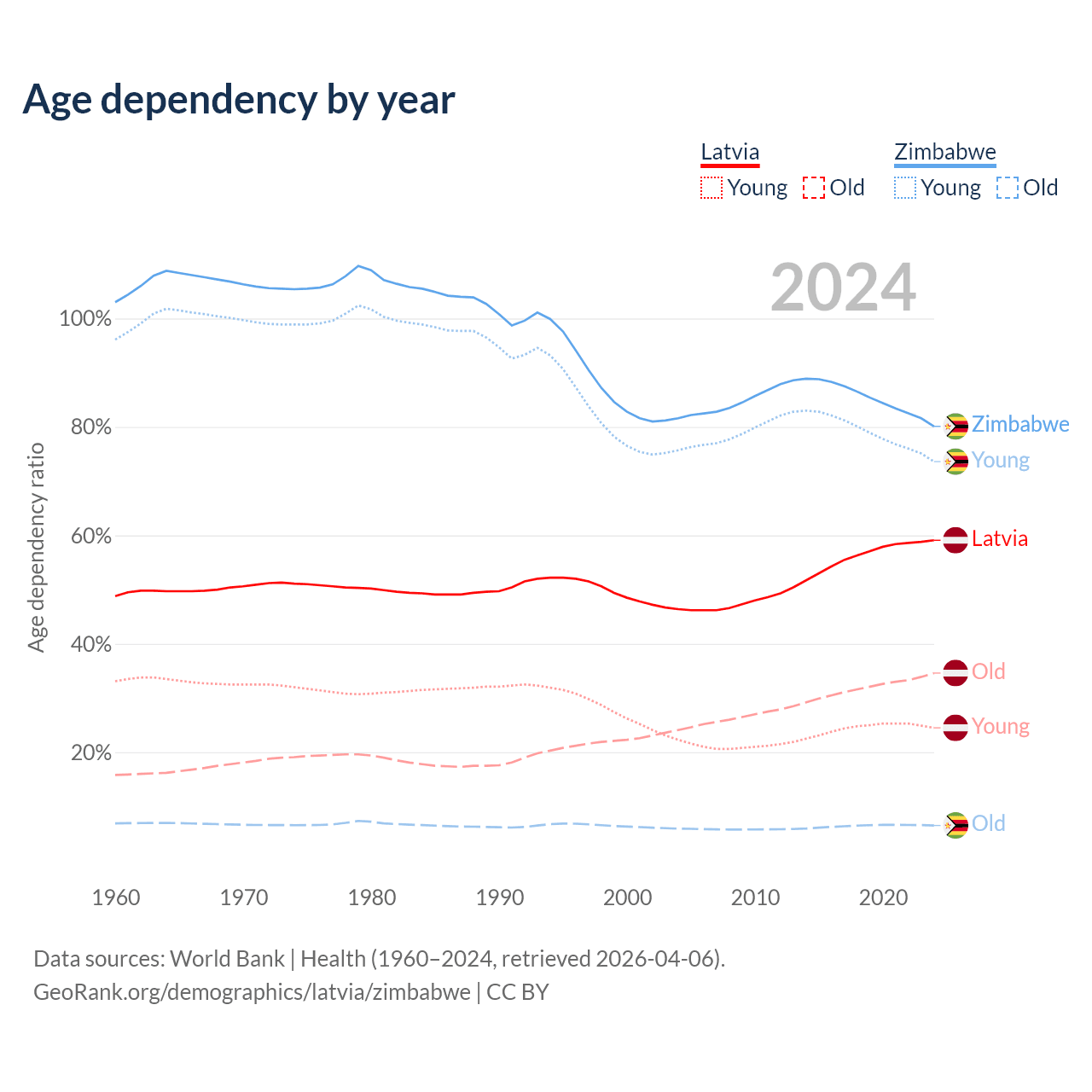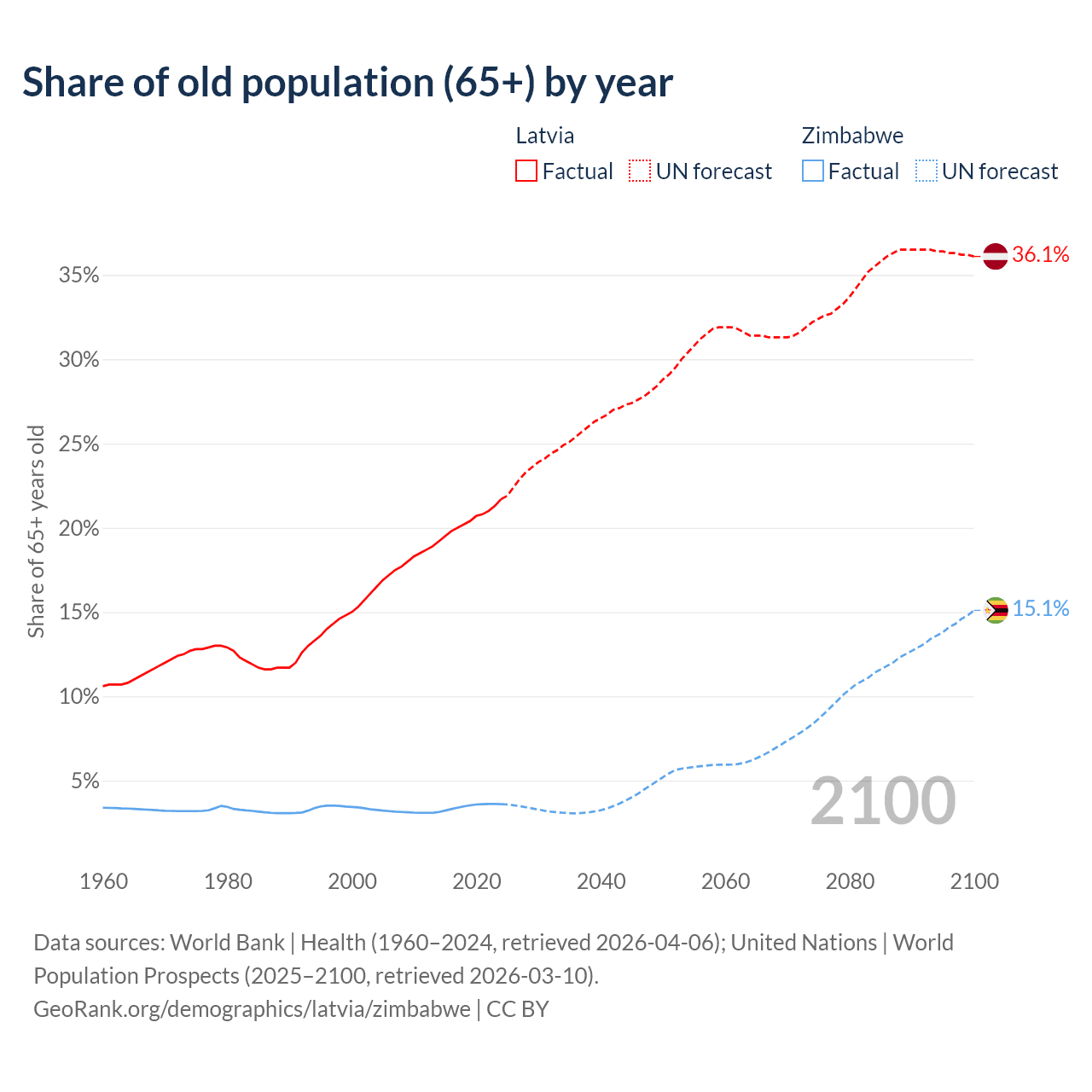 The share of older people aged 65 and over is 21.7% in Latvia and 3.6% in Zimbabwe. Life expectancy in Latvia compared to Zimbabwe .