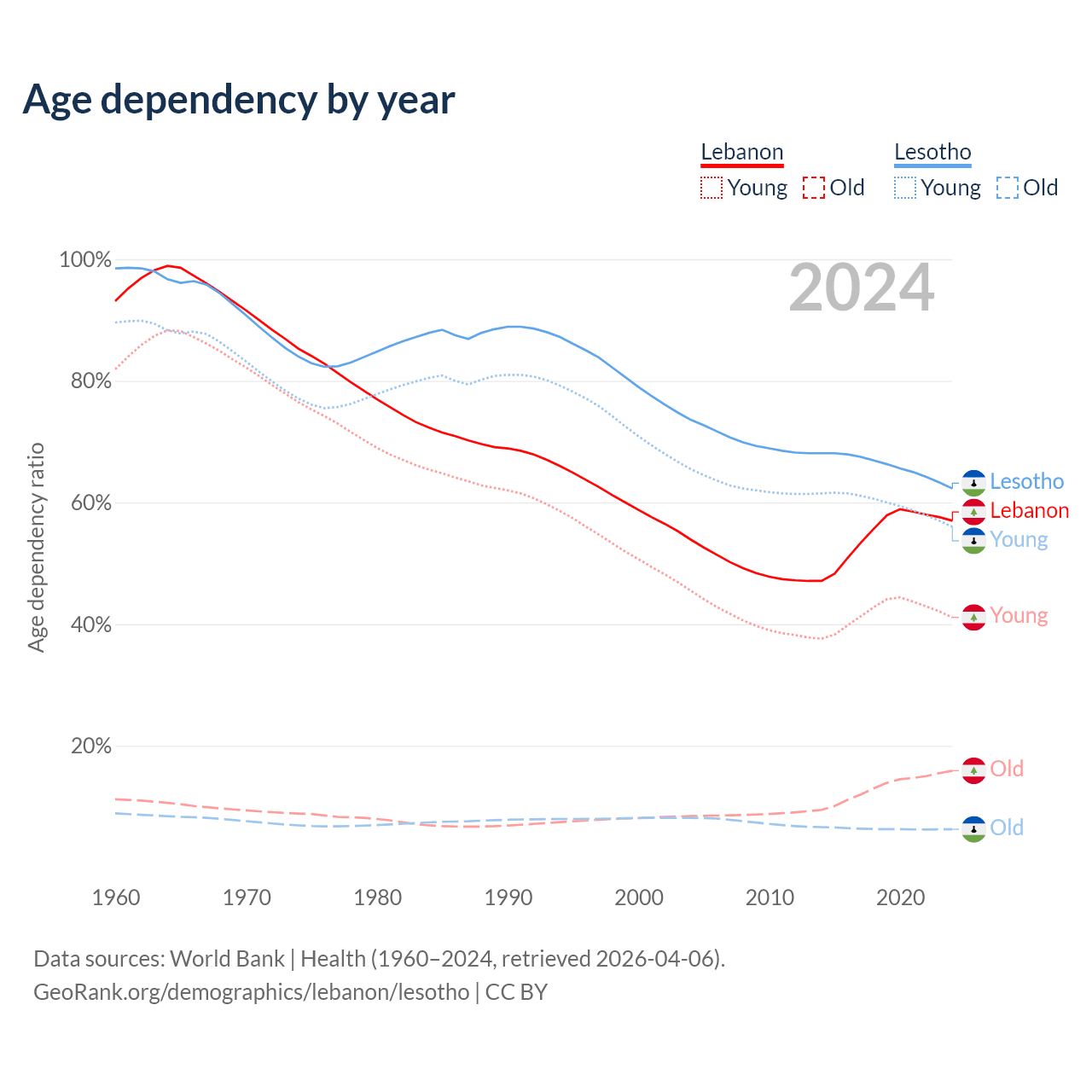 - Lebanon is ranked 106/196 by median age (oldest to youngest) vs 143/196 for Lesotho.