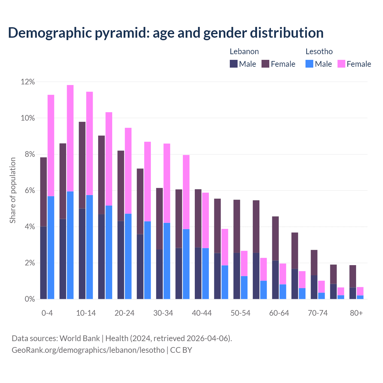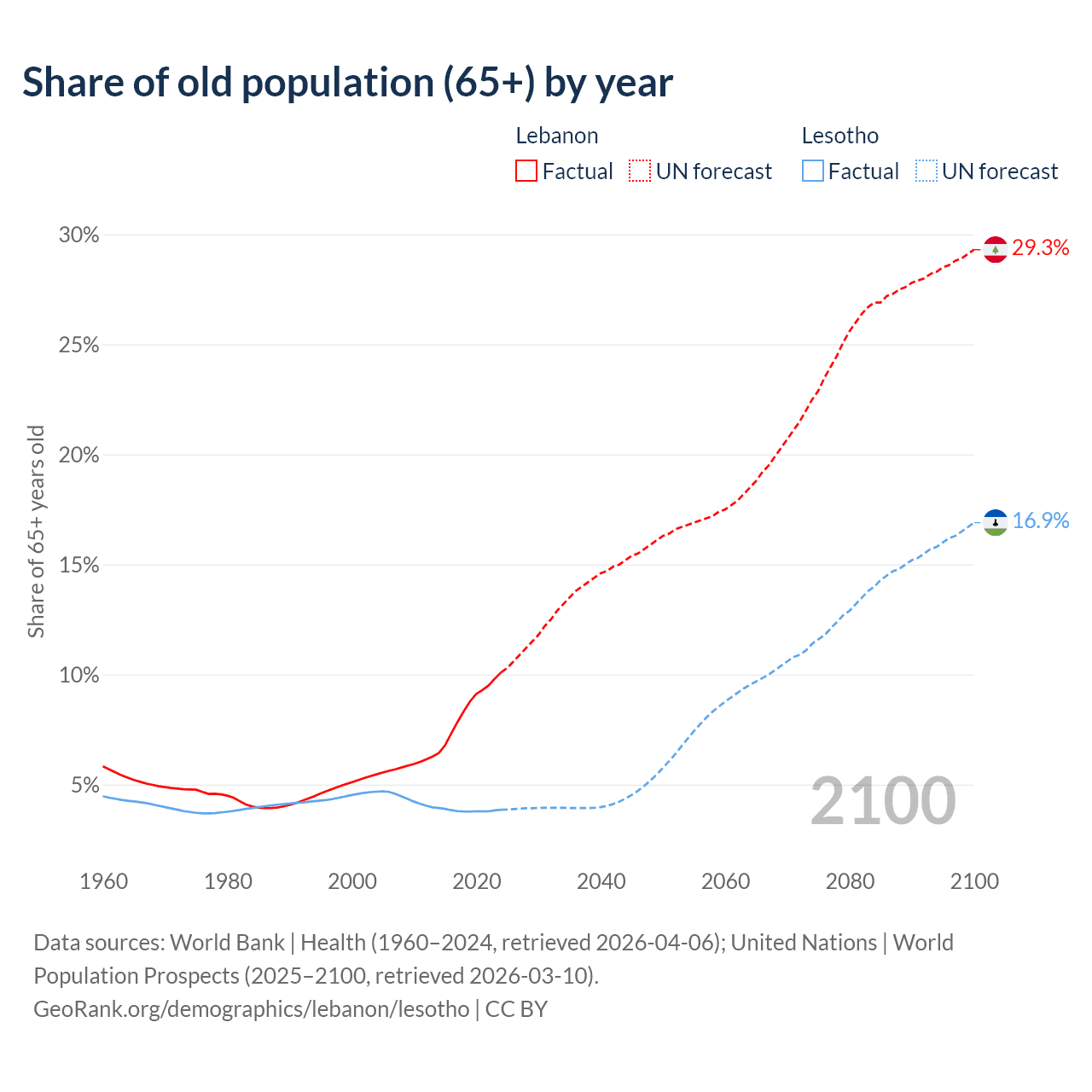 The share of older people aged 65 and over is 10.1% in Lebanon and 3.86% in Lesotho. Life expectancy in Lebanon compared to Lesotho .