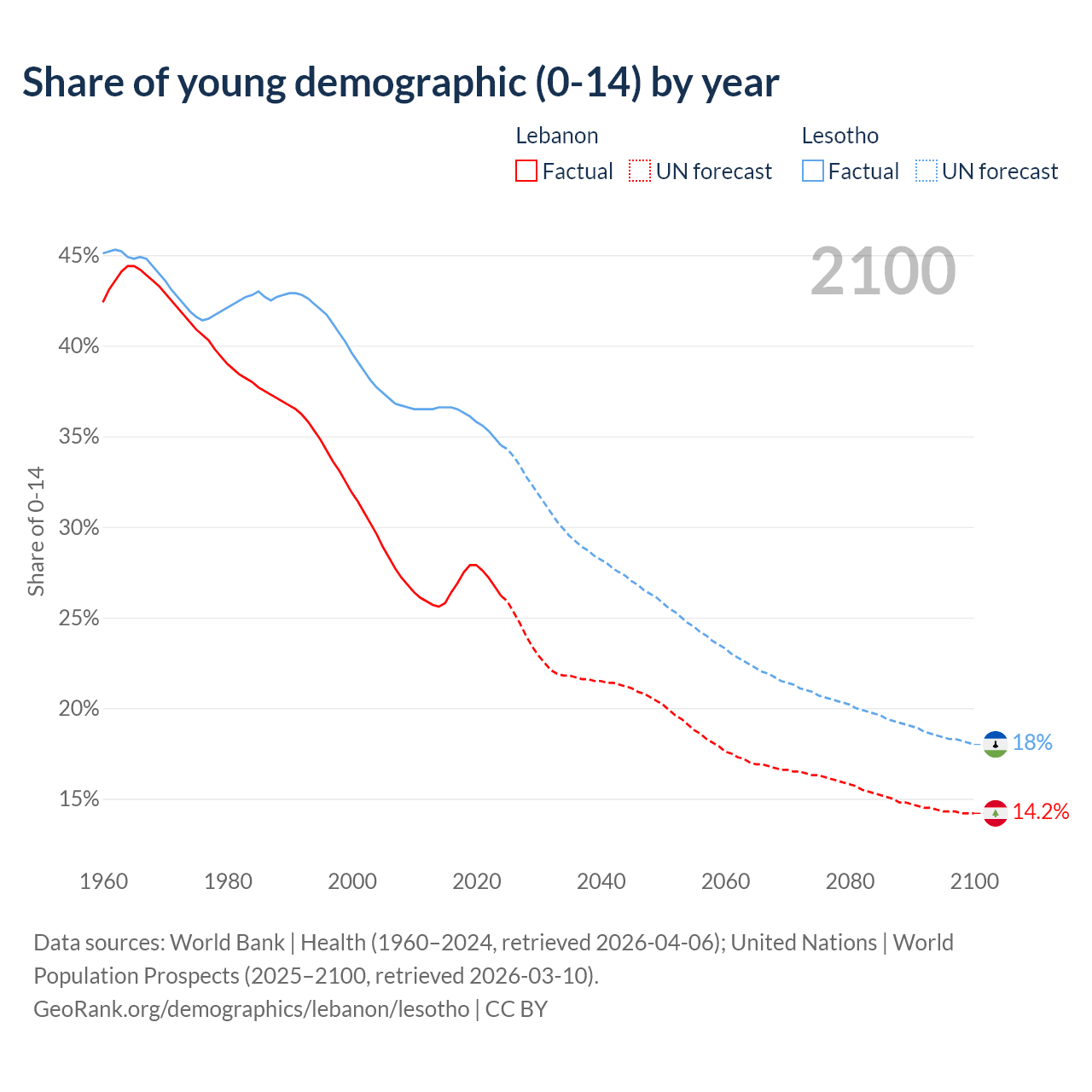 - The share of young demographic (0-15 years old) in Lebanon is 26.2% vs 34.5% in Lesotho.