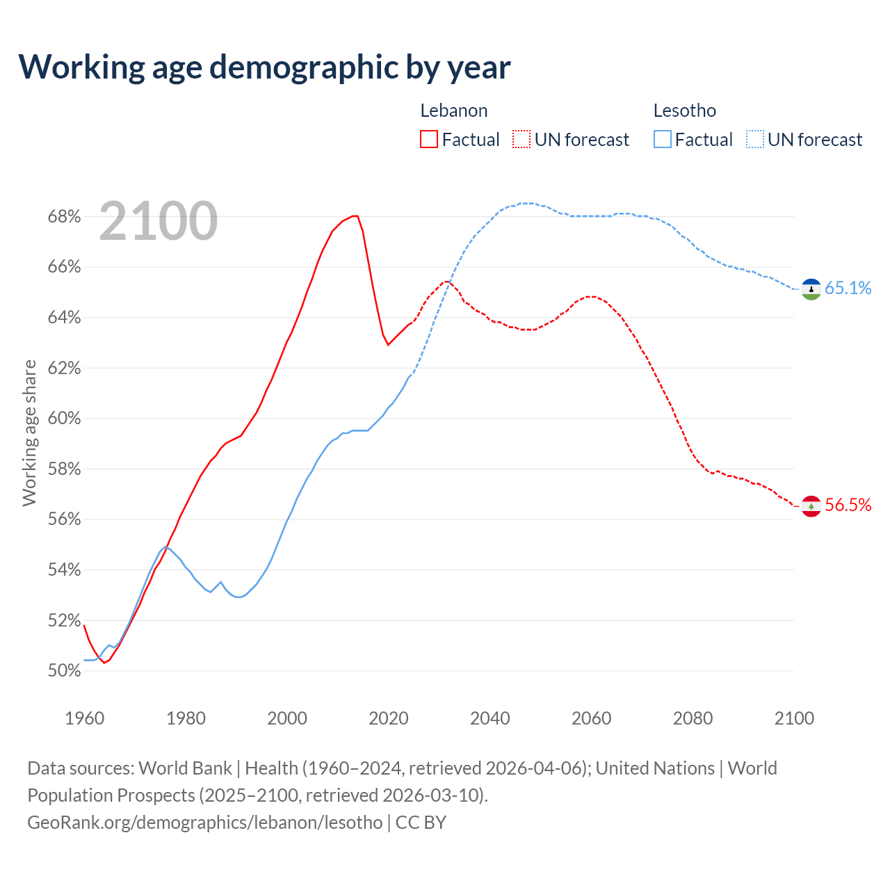 Median age Lebanon vs Lesotho, 1960-2100