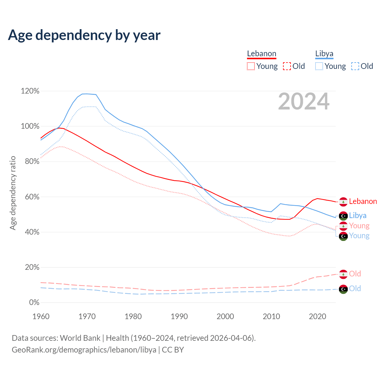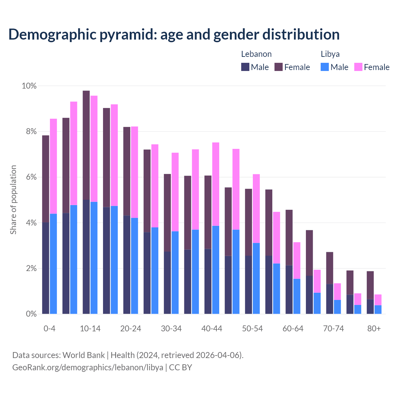 - Lebanon is ranked 106/196 by median age (oldest to youngest) vs 114/196 for Libya.