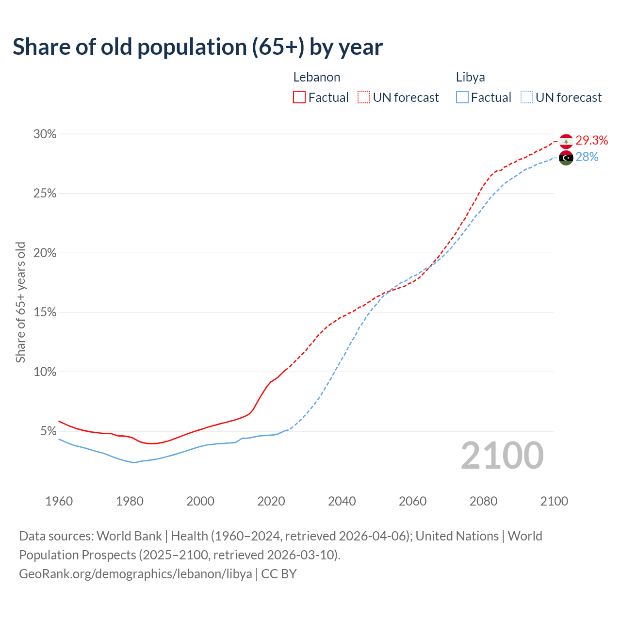 The share of older people aged 65 and over is 10.1% in Lebanon and 5.02% in Libya. Life expectancy in Lebanon compared to Libya .