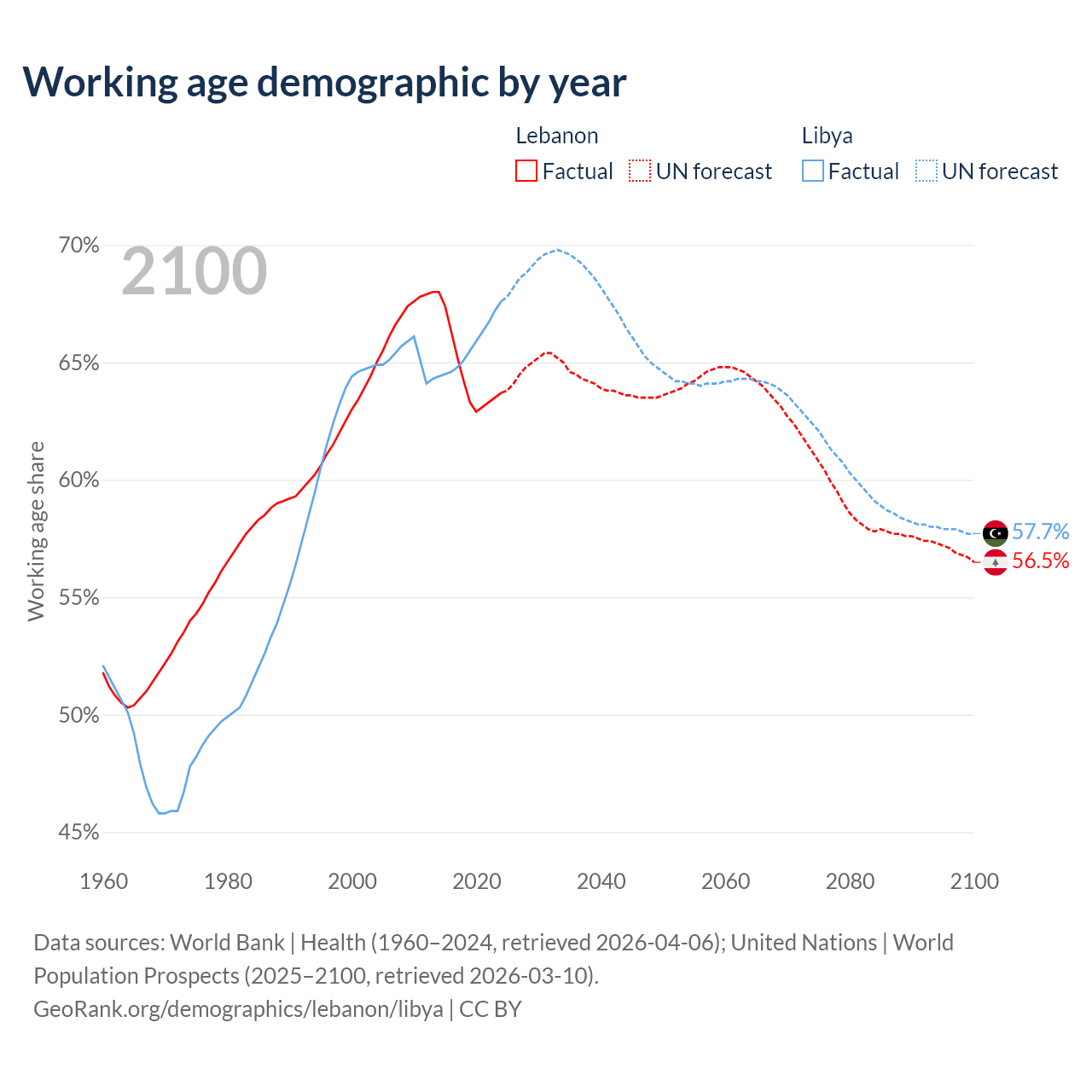- Lebanon has 3.76M working age adults (aged 15-64) vs 5.11M in Libya.