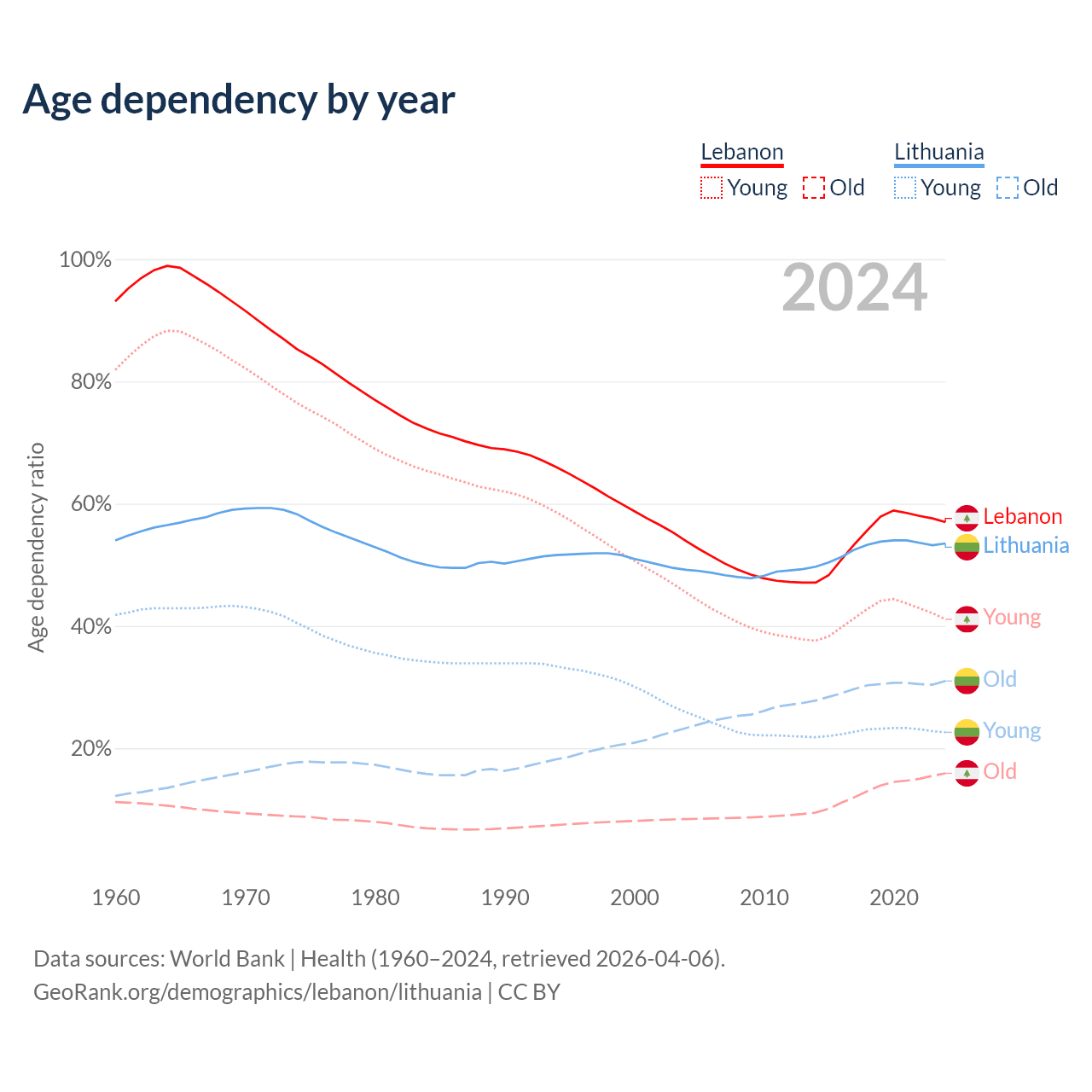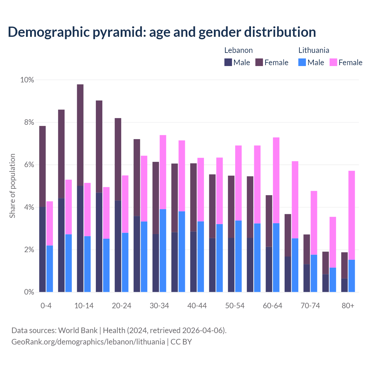 The share of older people aged 65 and over is 10.1% in Lebanon and 20.2% in Lithuania. Life expectancy in Lebanon compared to Lithuania .