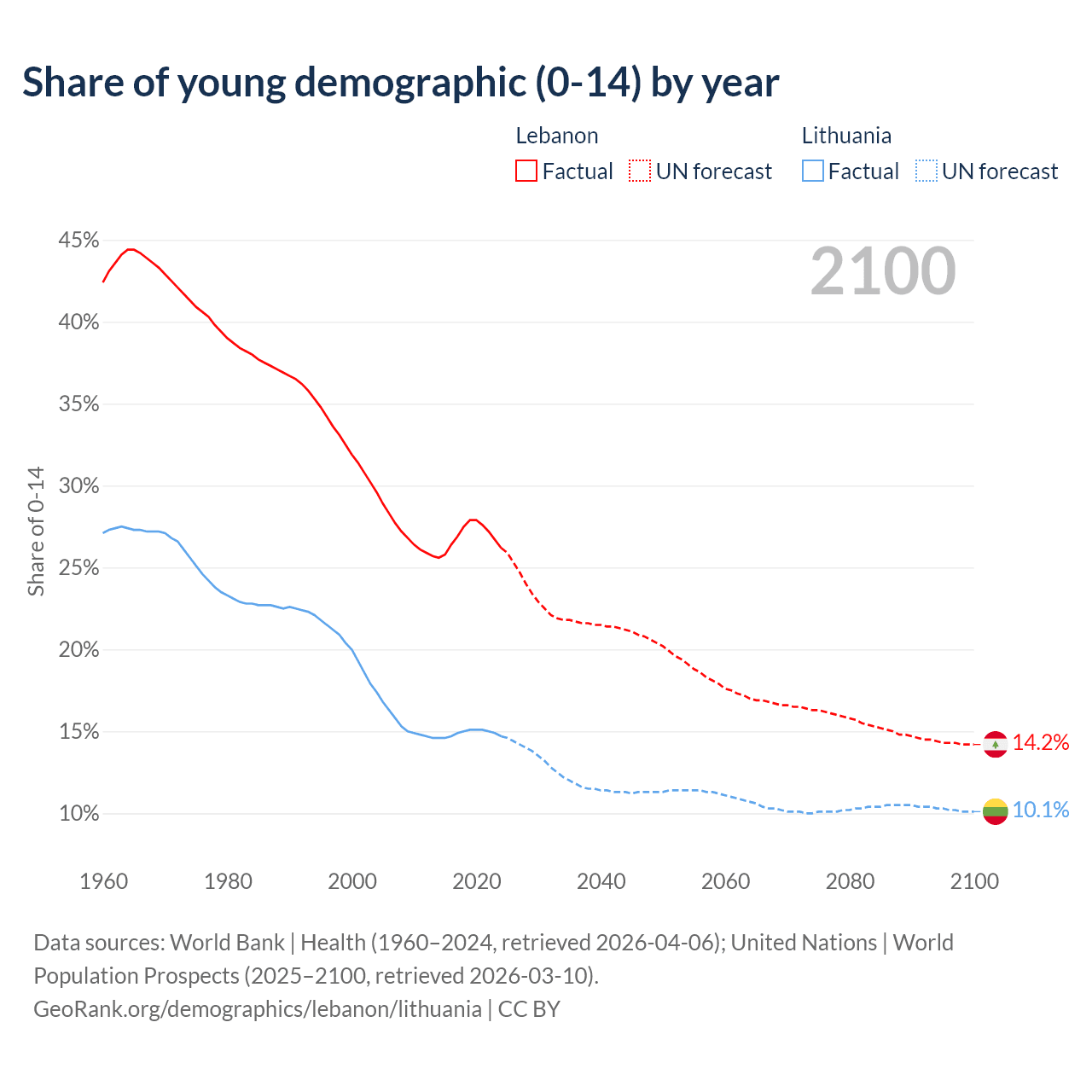 - The share of young demographic (0-15 years old) in Lebanon is 26.2% vs 14.7% in Lithuania.