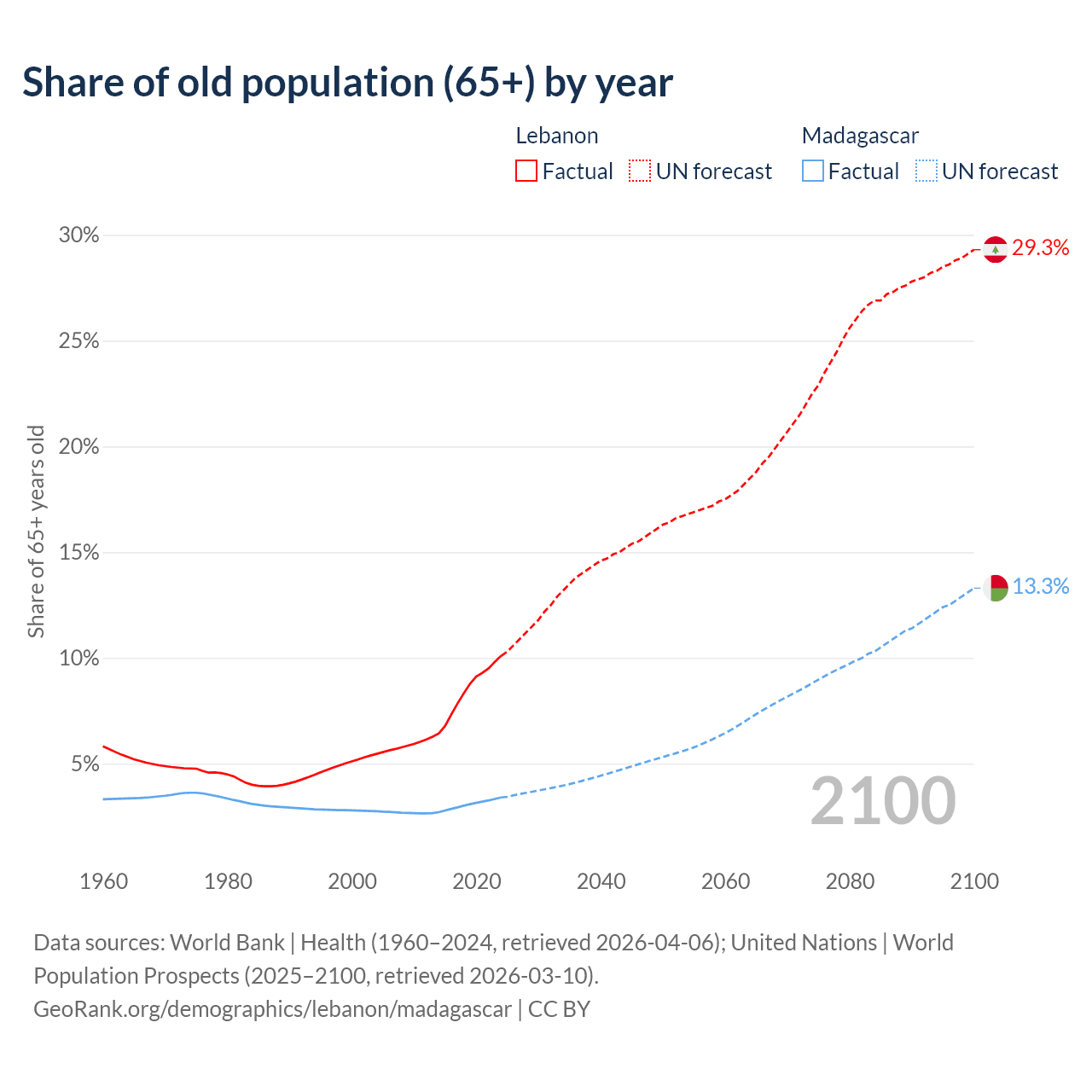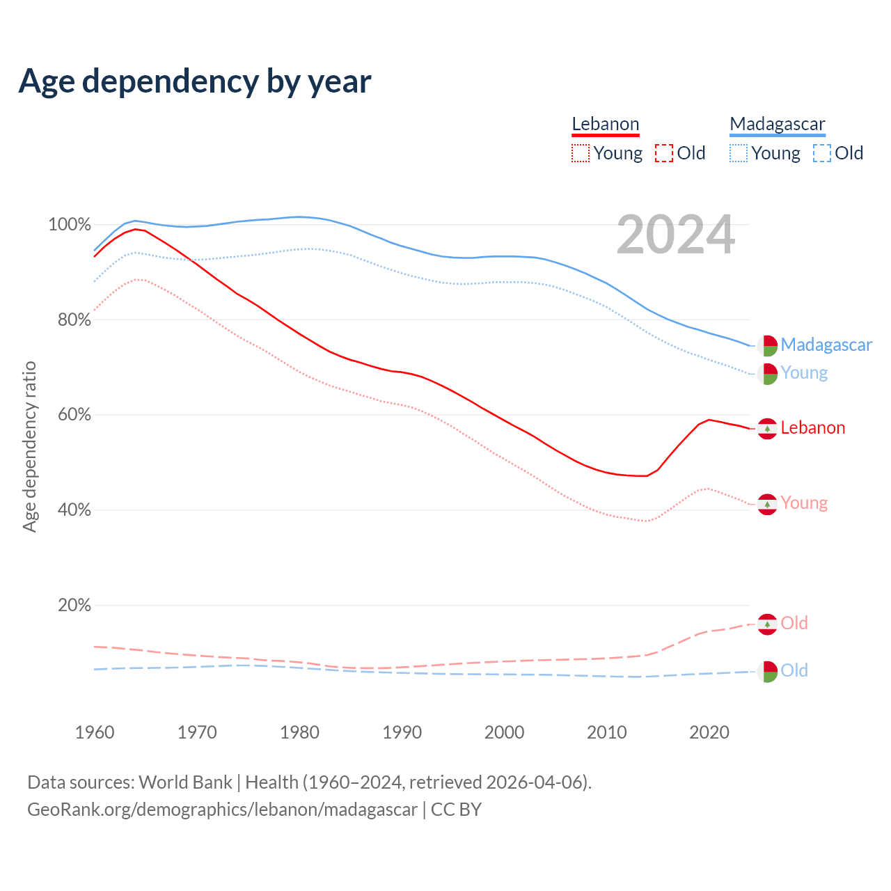 - The share of old-age demographic (65+) in Lebanon is 10.1% vs 3.41% in Madagascar.