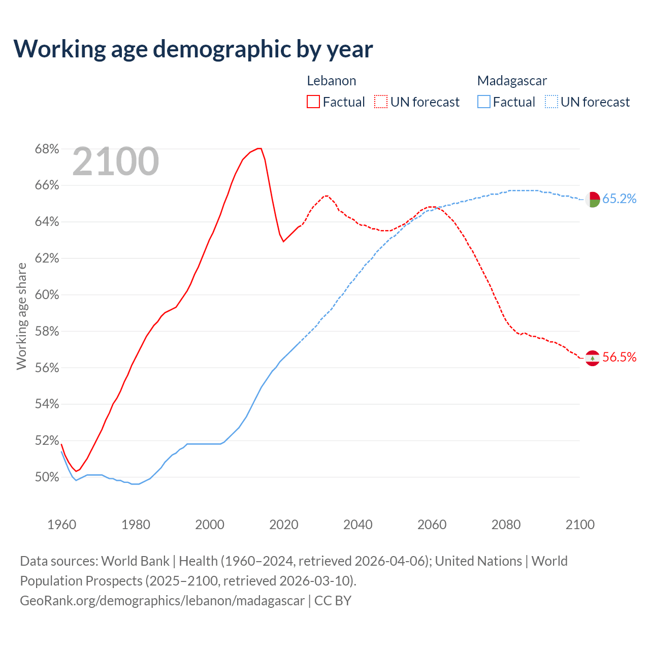 - Lebanon has 3.76M working age adults (aged 15-64) vs 19.4M in Madagascar.