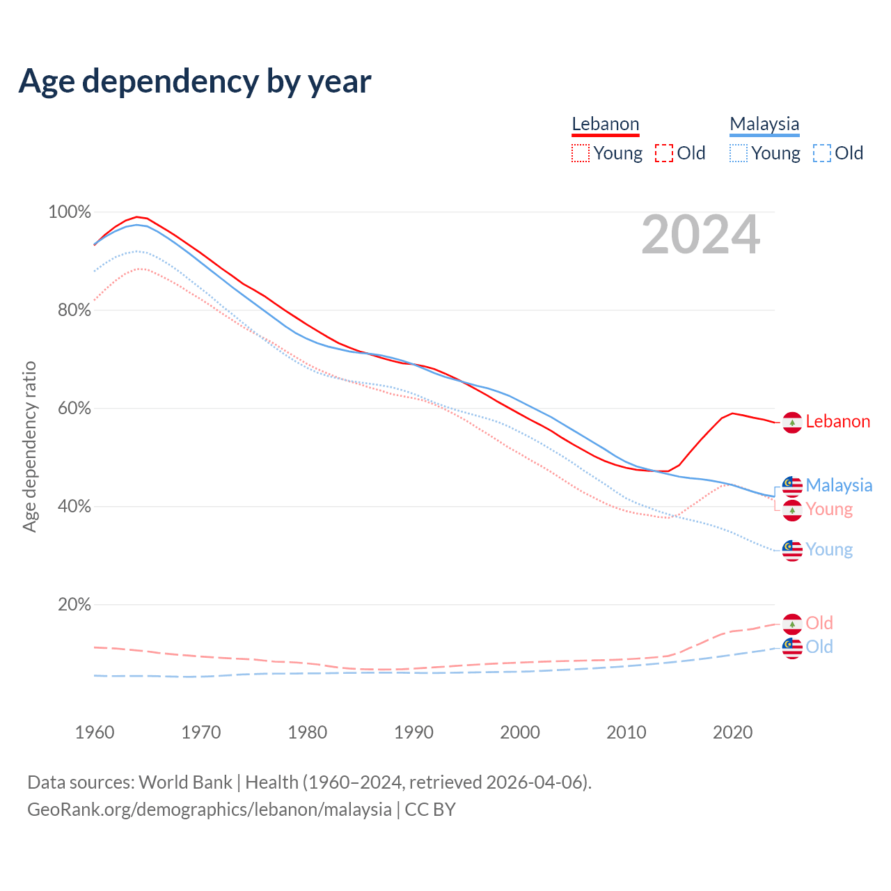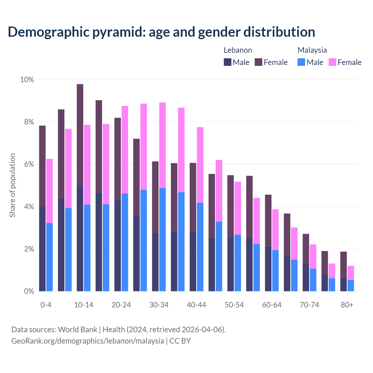 - Lebanon is ranked 106/196 by median age (oldest to youngest) vs 92/196 for Malaysia.