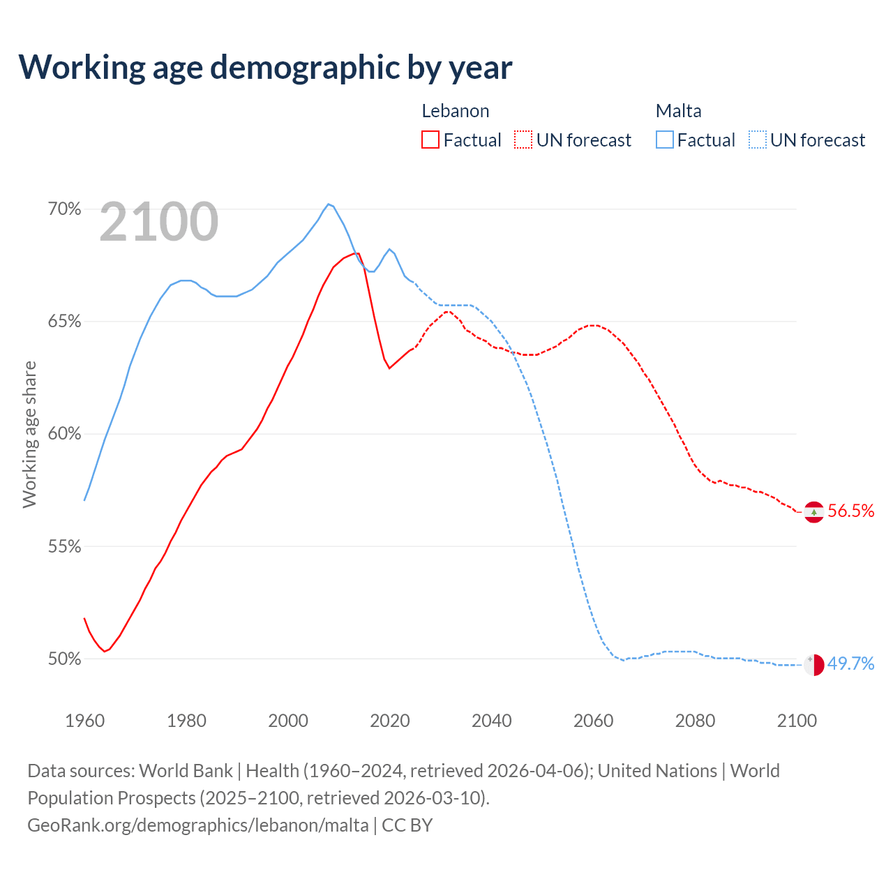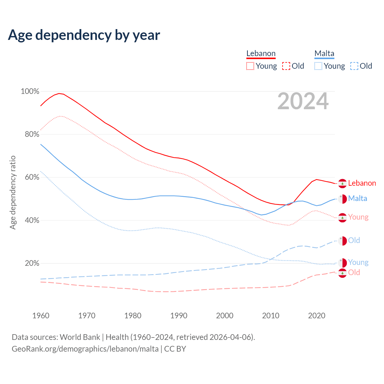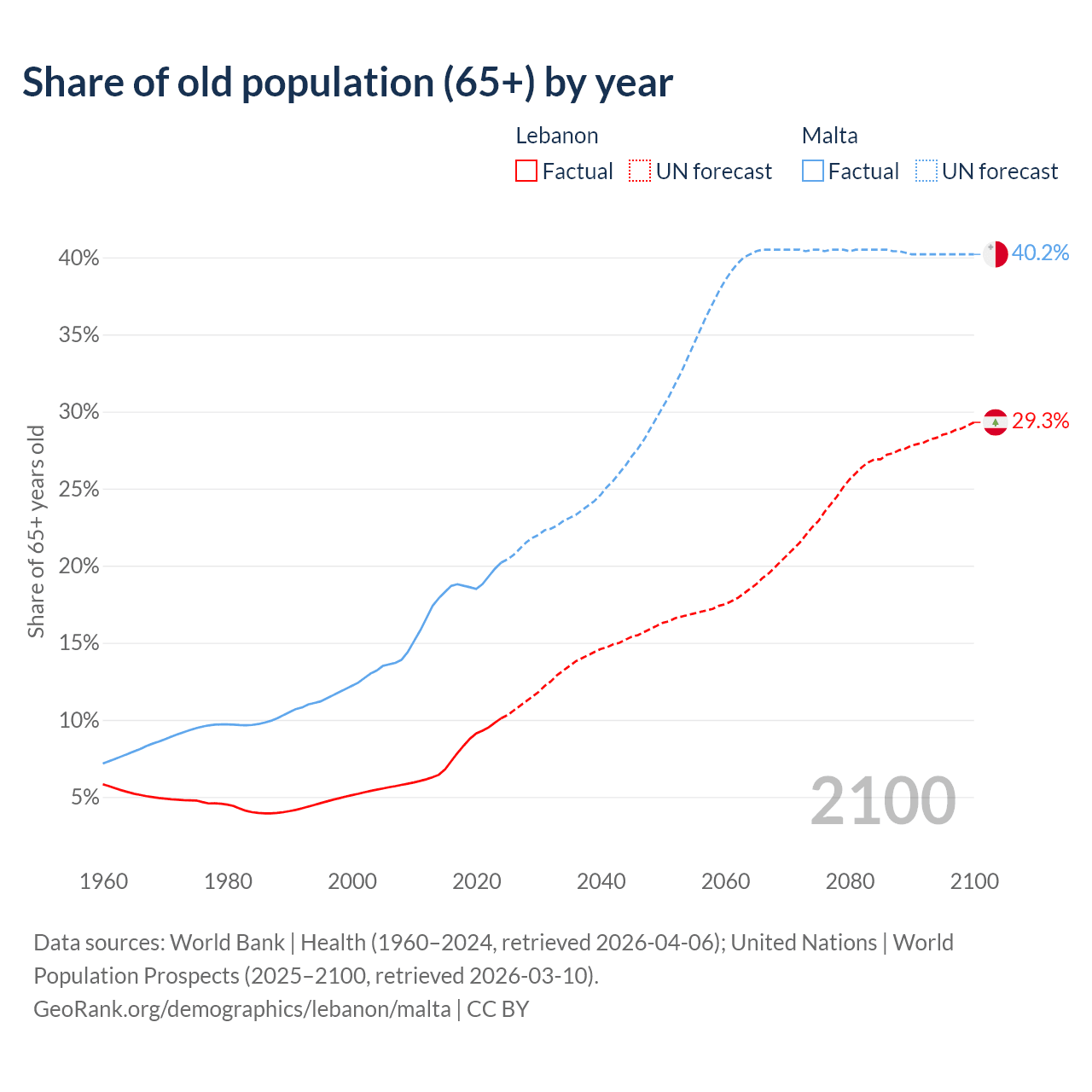 The share of older people aged 65 and over is 10.1% in Lebanon and 20.2% in Malta. Life expectancy in Lebanon compared to Malta .