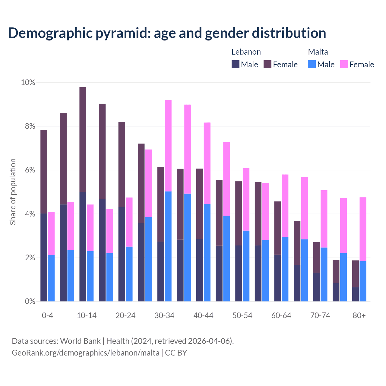 - The share of old-age demographic (65+) in Lebanon is 10.1% vs 20.2% in Malta.