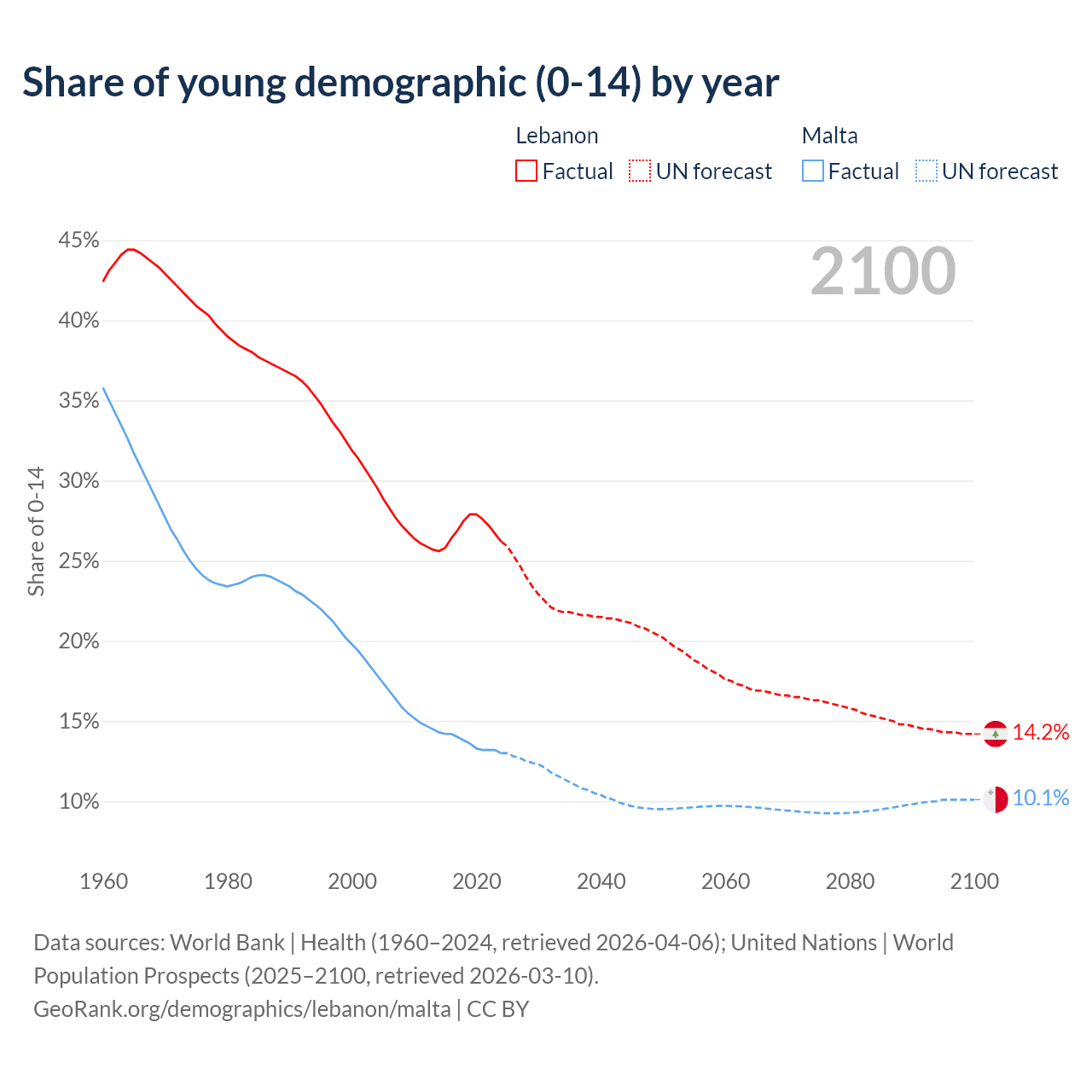 - The share of young demographic (0-15 years old) in Lebanon is 26.2% vs 13% in Malta.