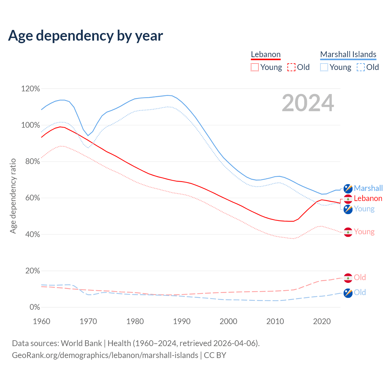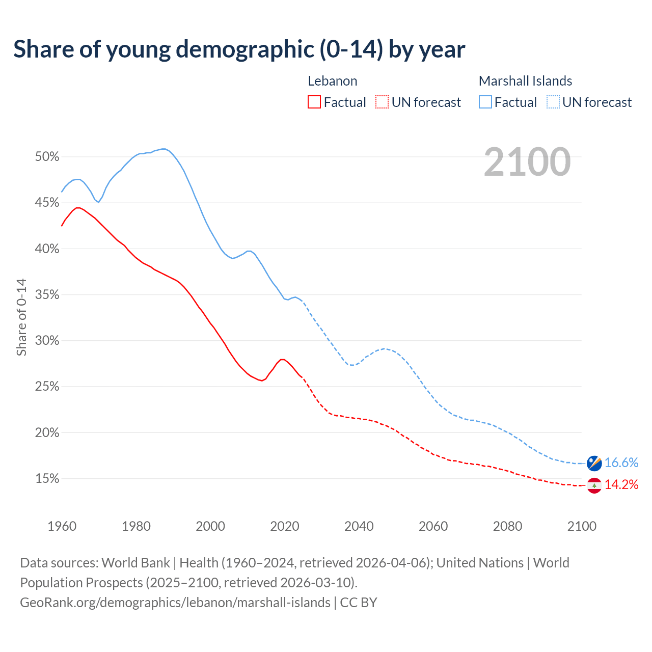 - The share of young demographic (0-15 years old) in Lebanon is 26.2% vs 34.5% in the Marshall Islands.