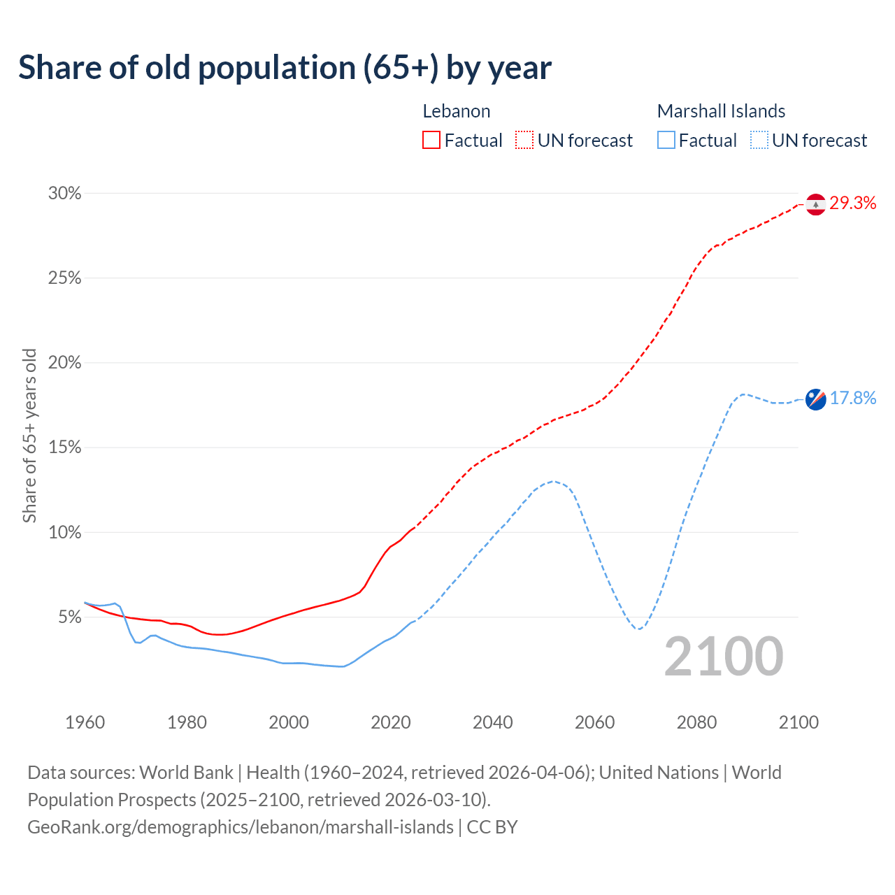 The share of older people aged 65 and over is 10.1% in Lebanon and 4.64% in the Marshall Islands. Life expectancy in Lebanon compared to the Marshall Islands .