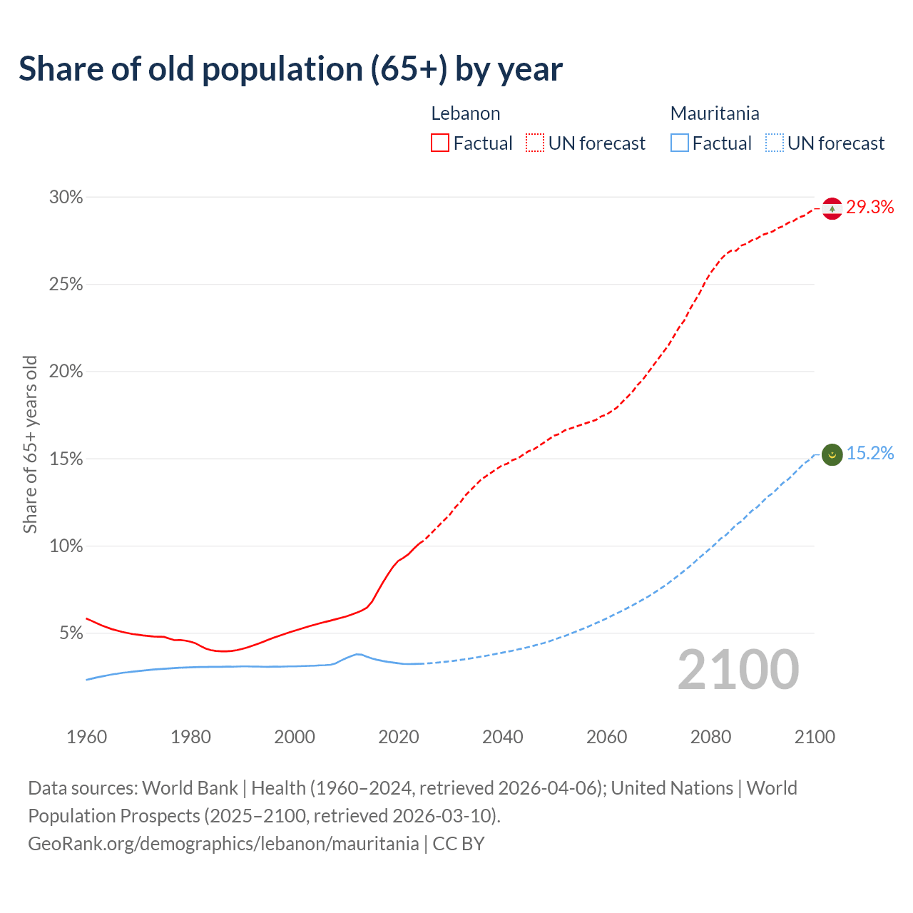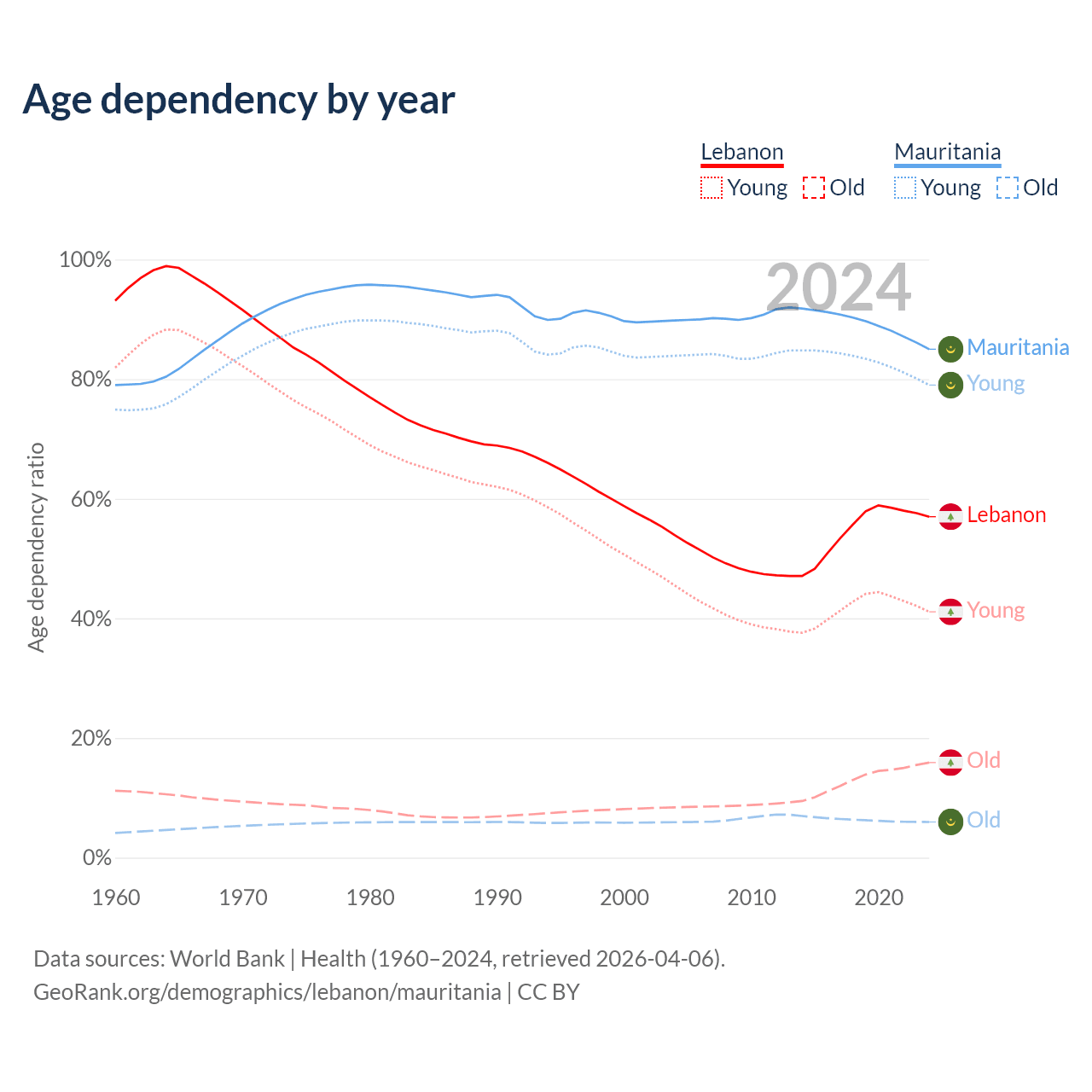 - The share of old-age demographic (65+) in Lebanon is 10.1% vs 3.23% in Mauritania.