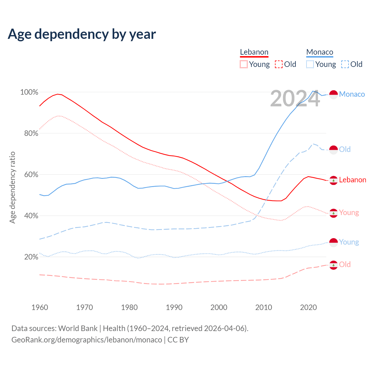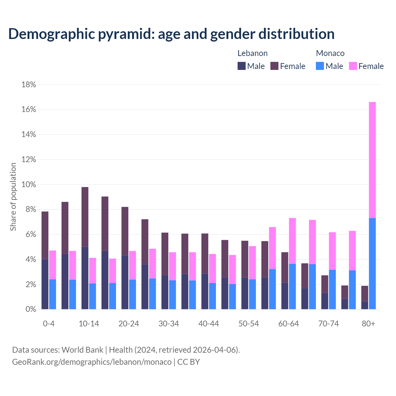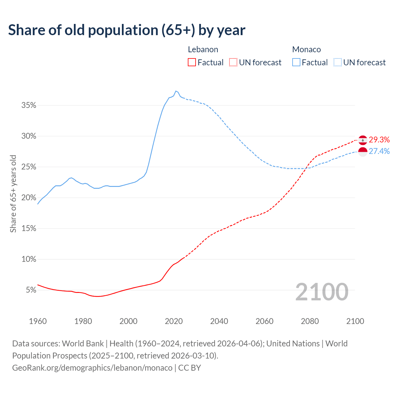 The share of older people aged 65 and over is 10.1% in Lebanon and 36.2% in Monaco. Life expectancy in Lebanon compared to Monaco .