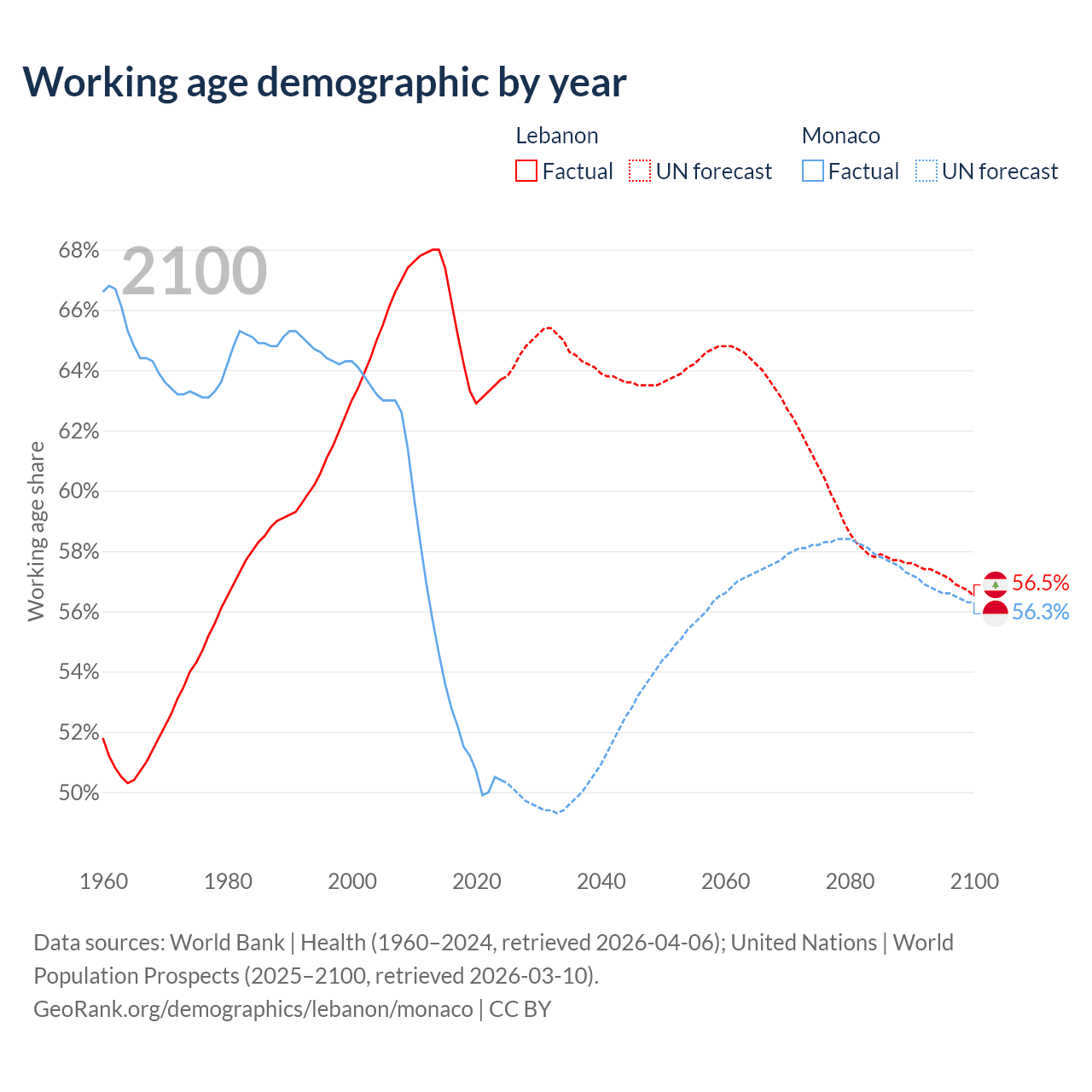 - Lebanon has 3.76M working age adults (aged 15-64) vs 19.2K in Monaco.