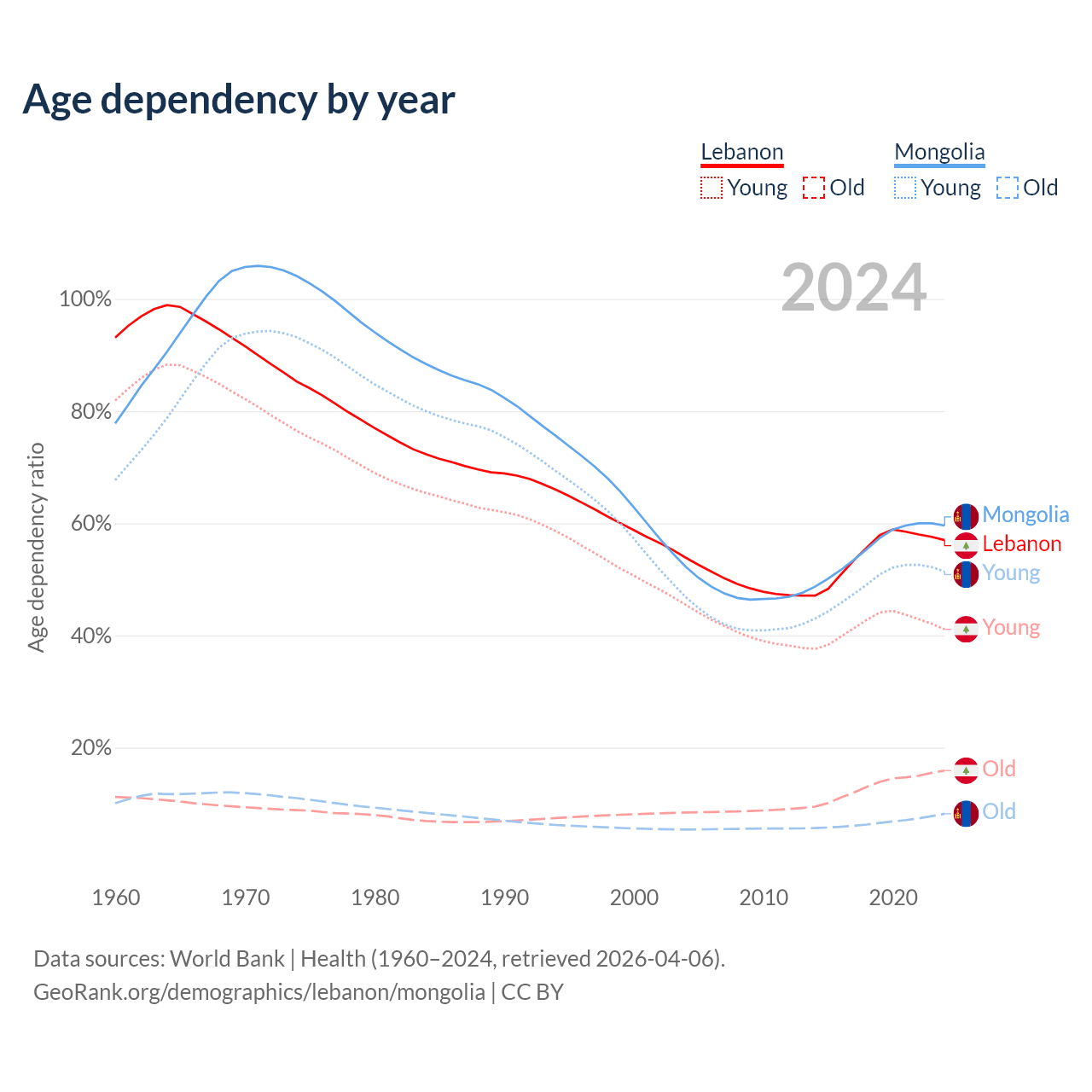 - Lebanon is ranked 106/196 by median age (oldest to youngest) vs 117/196 for Mongolia.