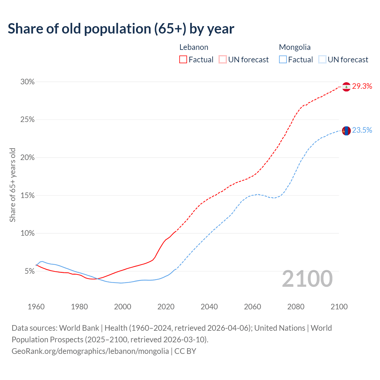 The share of older people aged 65 and over is 10.1% in Lebanon and 5.14% in Mongolia. Life expectancy in Lebanon compared to Mongolia .