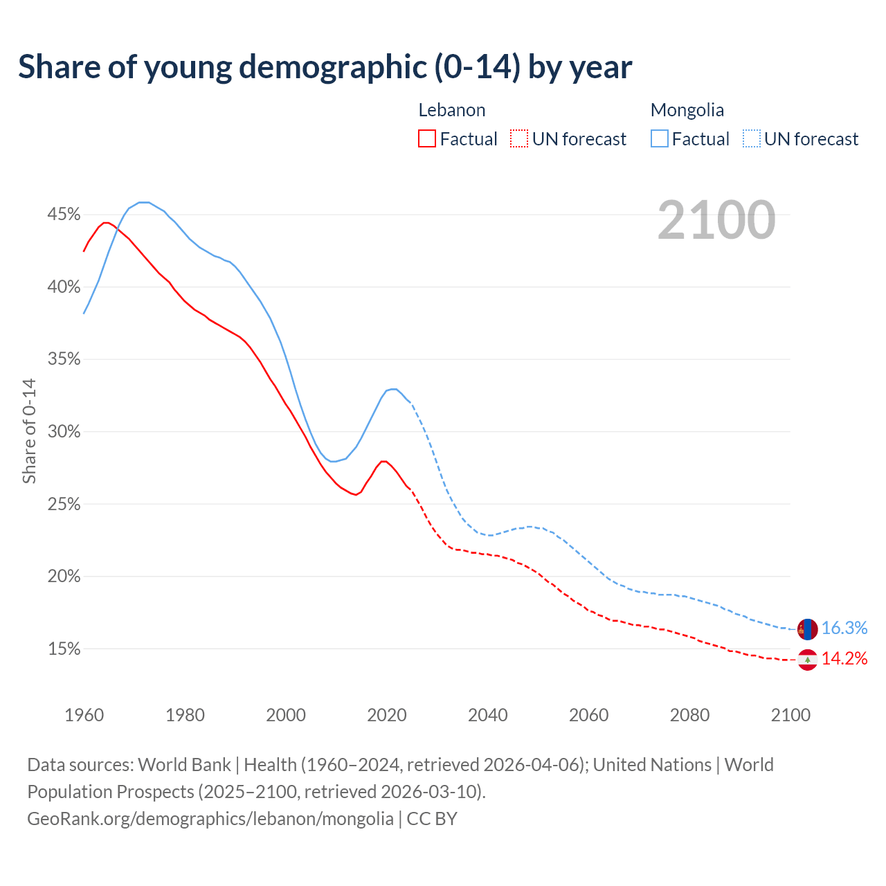 - The share of young demographic (0-15 years old) in Lebanon is 26.2% vs 32.2% in Mongolia.