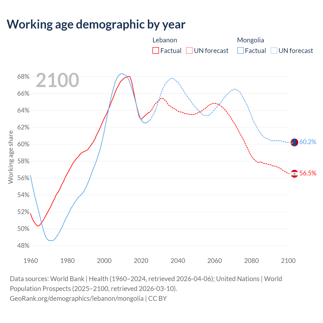 - Lebanon has 3.76M working age adults (aged 15-64) vs 2.27M in Mongolia.
