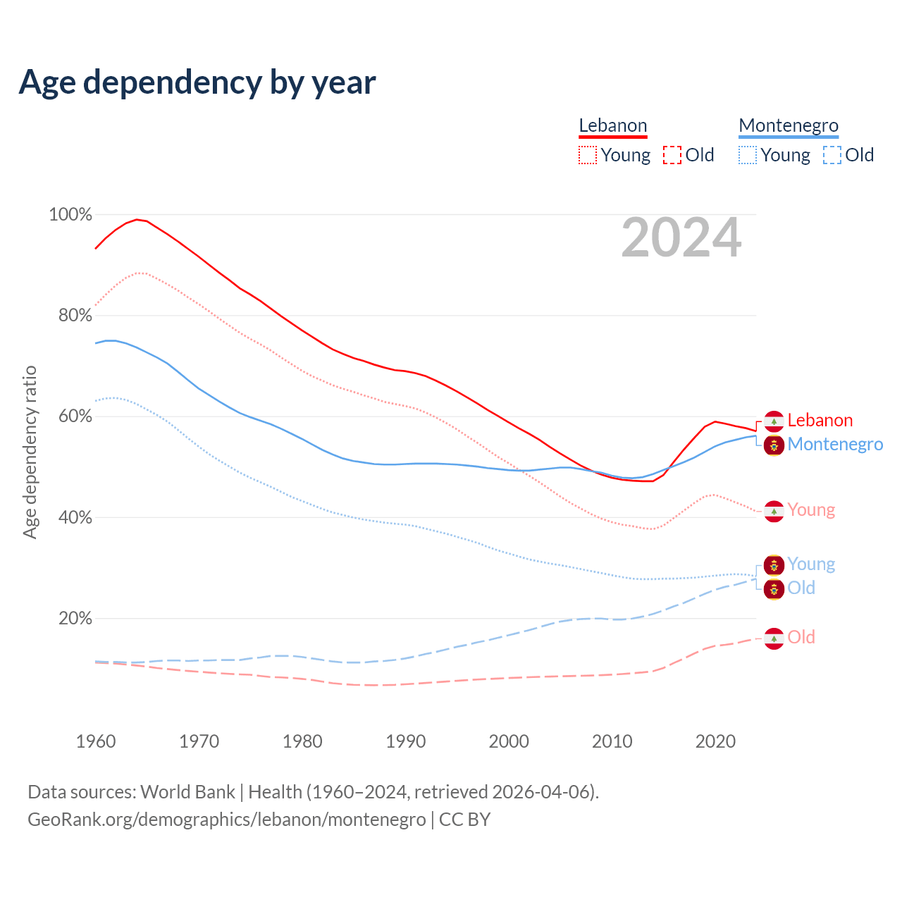 - Lebanon is ranked 106/196 by median age (oldest to youngest) vs 45/196 for Montenegro.