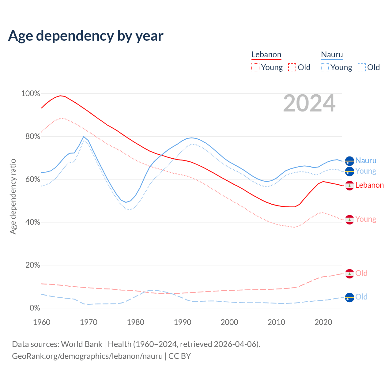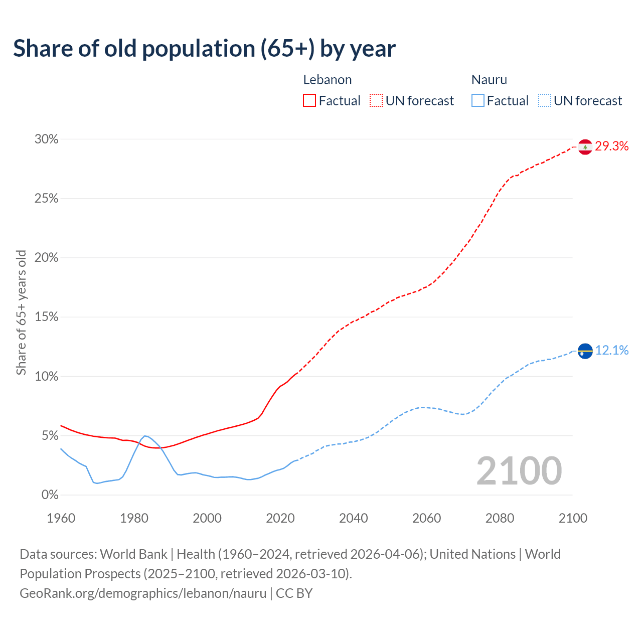 The share of older people aged 65 and over is 10.1% in Lebanon and 2.85% in Nauru. Life expectancy in Lebanon compared to Nauru .