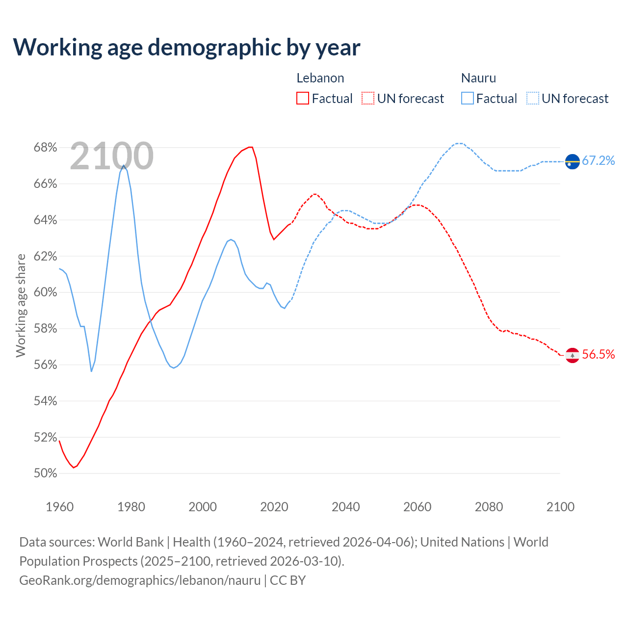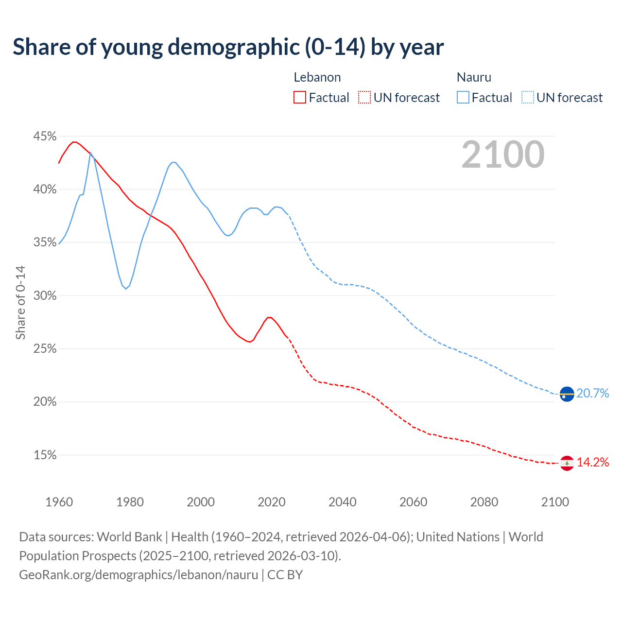 Median age Lebanon vs Nauru, 1960-2100