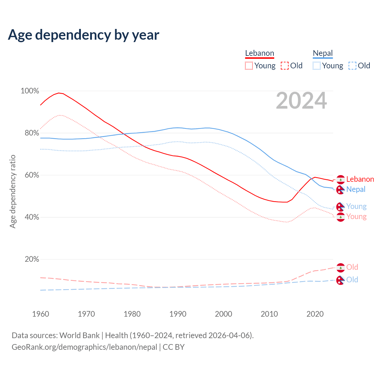 - The share of old-age demographic (65+) in Lebanon is 10.1% vs 6.5% in Nepal.