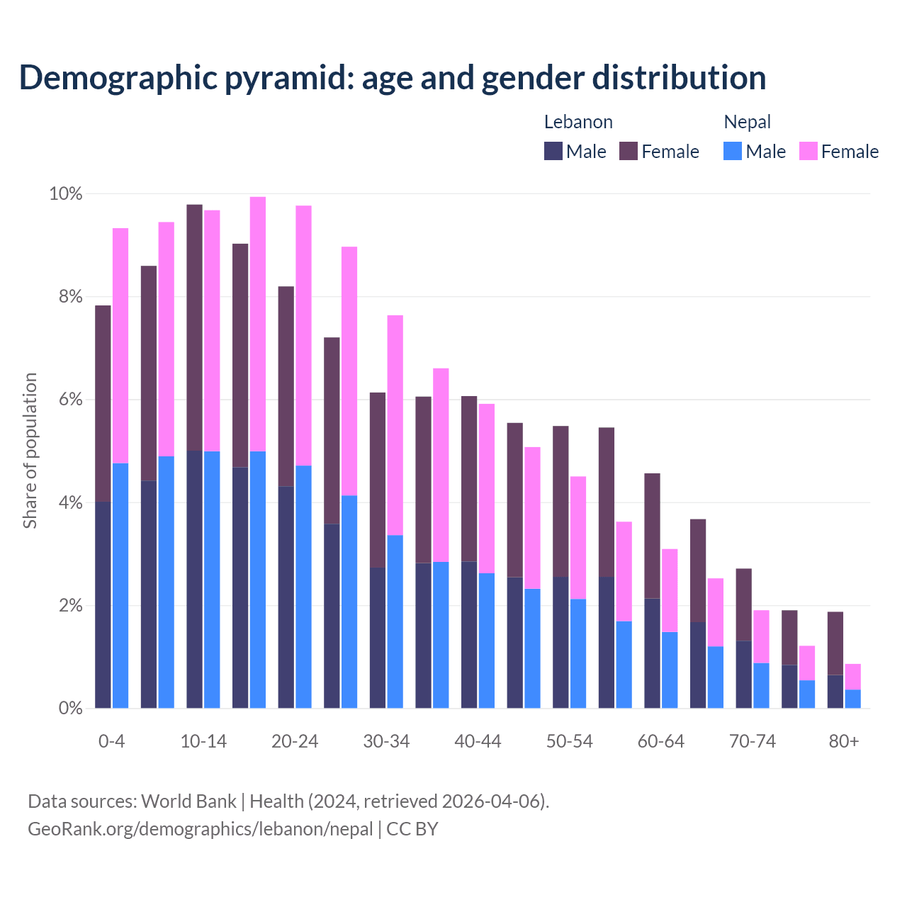 The share of older people aged 65 and over is 10.1% in Lebanon and 6.5% in Nepal. Life expectancy in Lebanon compared to Nepal .