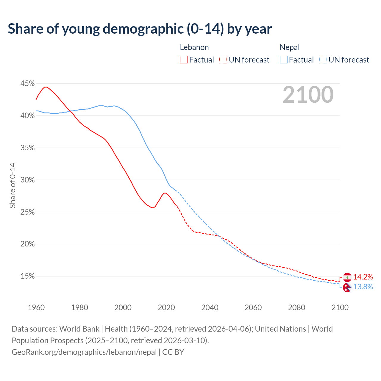 - The share of young demographic (0-15 years old) in Lebanon is 26.2% vs 28.4% in Nepal.