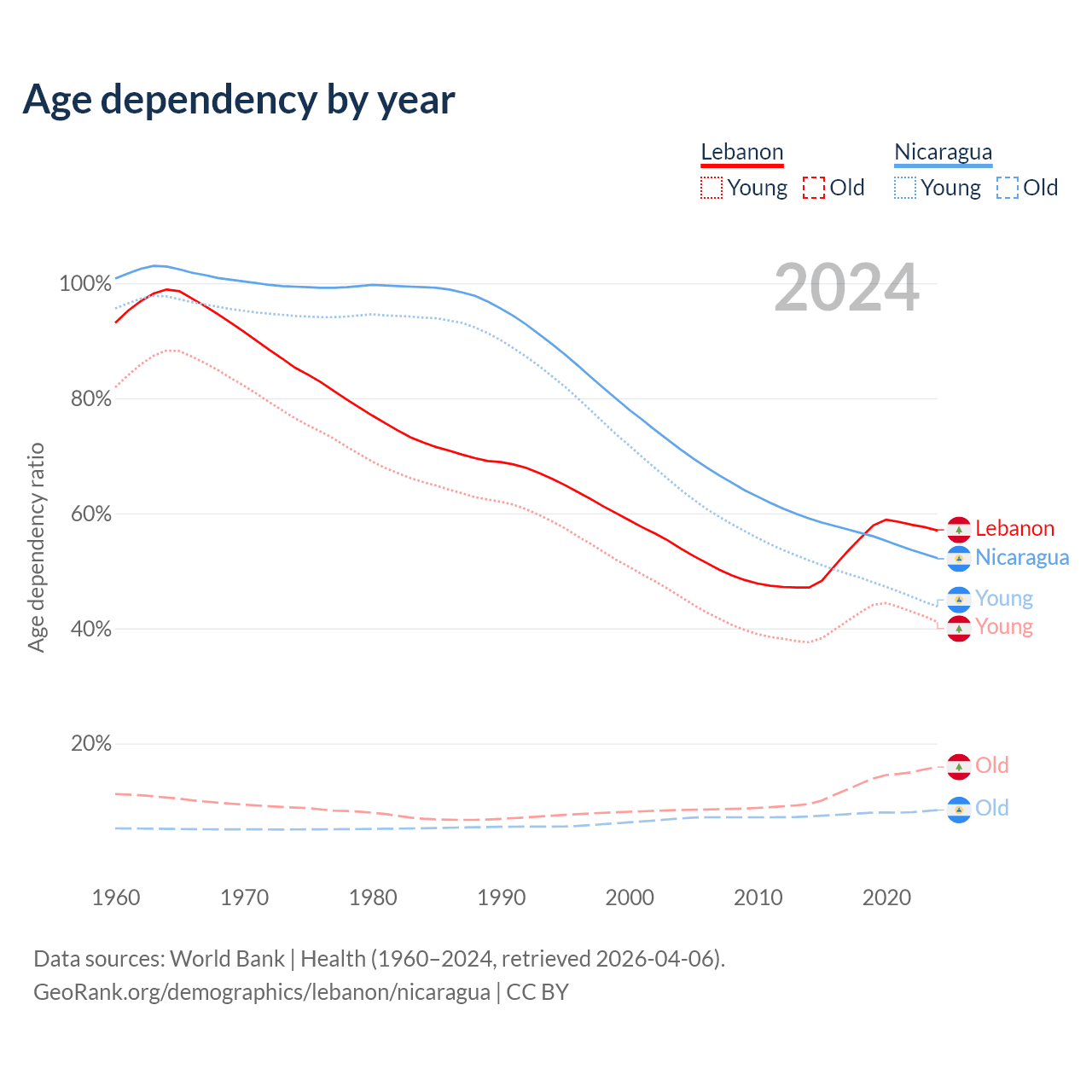 Data sources: World Bank | Health (1960–2024, retrieved 2026-04-06); U.S. Census Bureau (1960–2024, retrieved 2026-02-08).