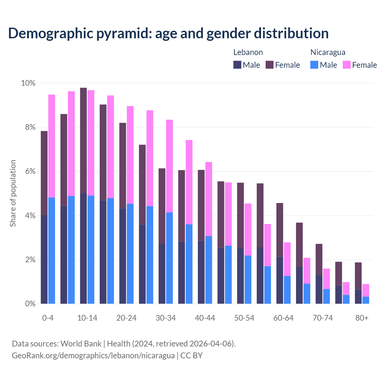 - The share of old-age demographic (65+) in Lebanon is 10.1% vs 5.53% in Nicaragua.