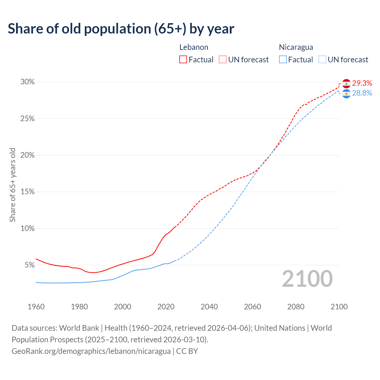 The share of older people aged 65 and over is 10.1% in Lebanon and 5.53% in Nicaragua. Life expectancy in Lebanon compared to Nicaragua .