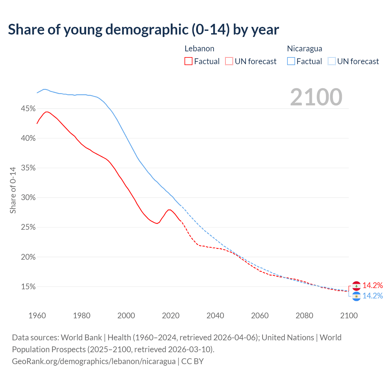 - The share of young demographic (0-15 years old) in Lebanon is 26.2% vs 28.8% in Nicaragua.