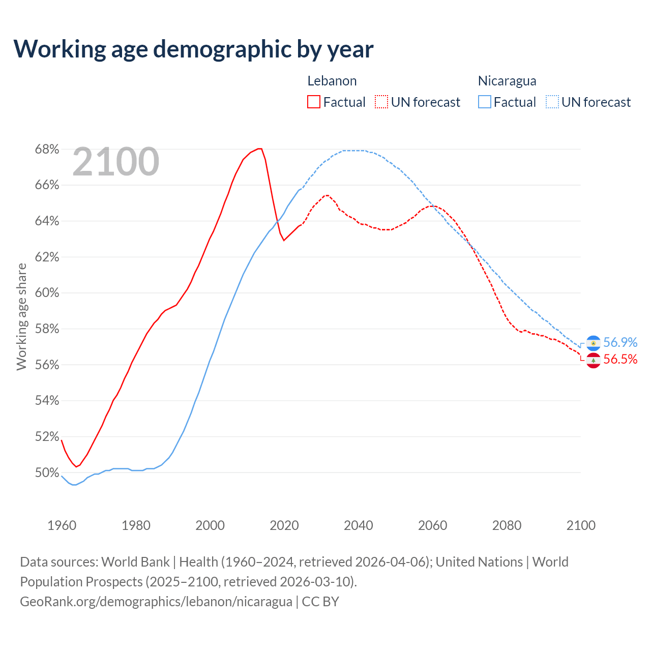 Median age Lebanon vs Nicaragua, 1960-2100