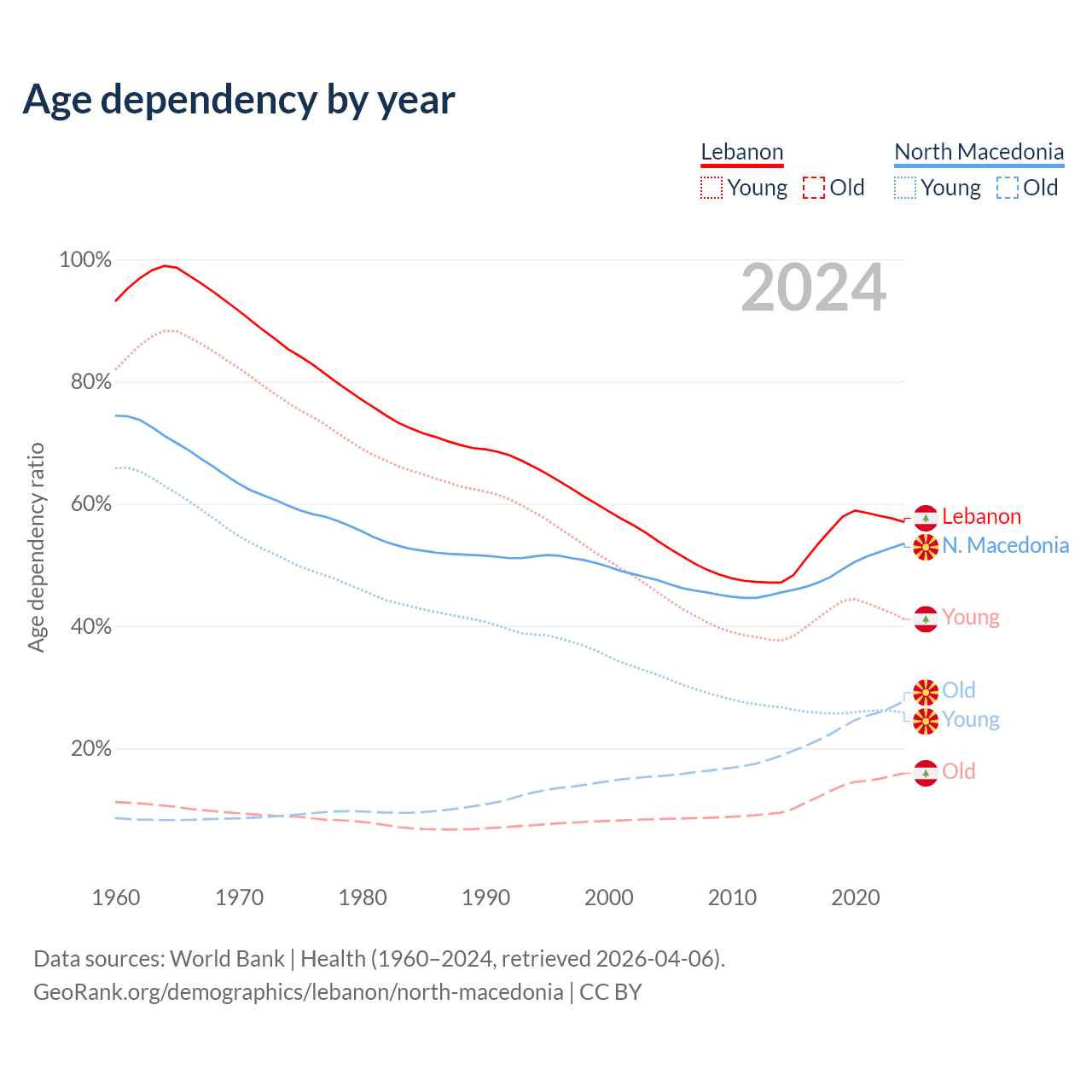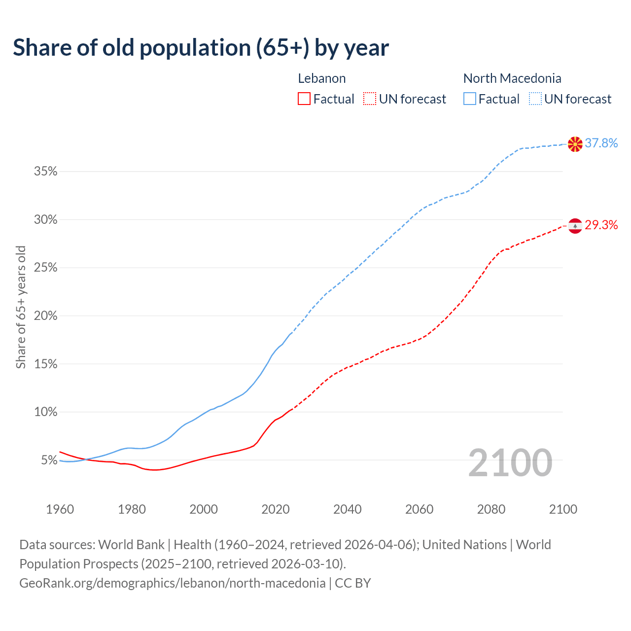 The share of older people aged 65 and over is 10.1% in Lebanon and 18% in North Macedonia. Life expectancy in Lebanon compared to North Macedonia .
