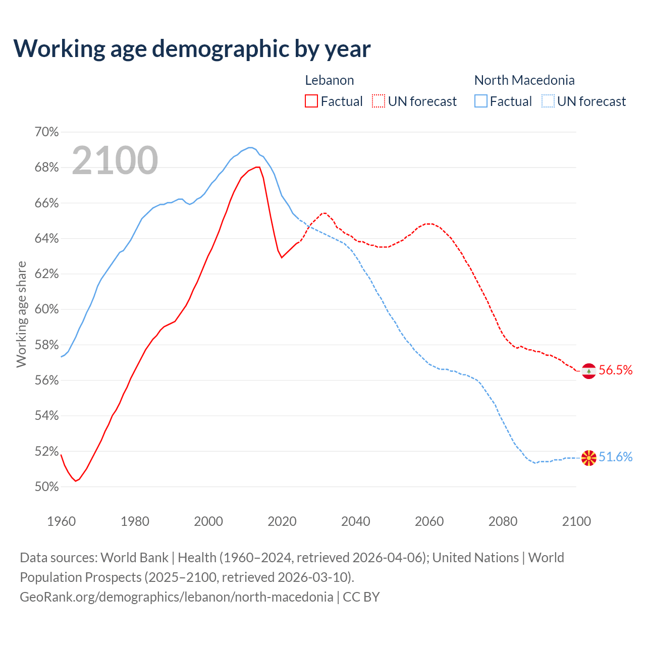 Median age Lebanon vs North Macedonia, 1960-2100