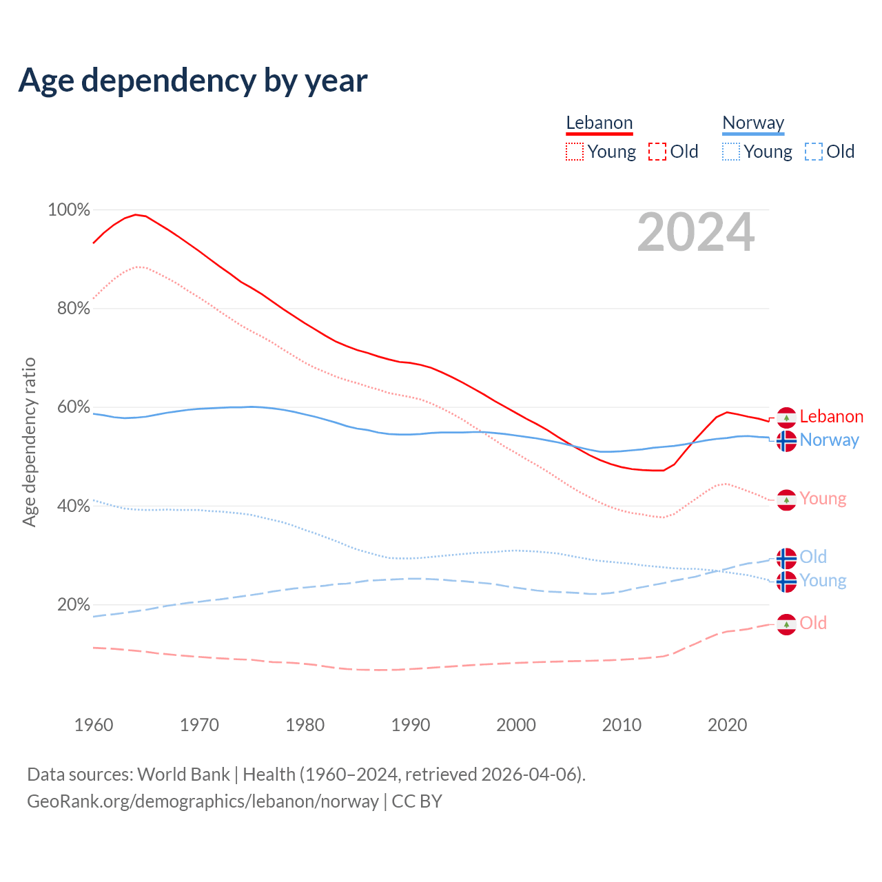 - The share of young demographic (0-15 years old) in Lebanon is 26.2% vs 16.2% in Norway.