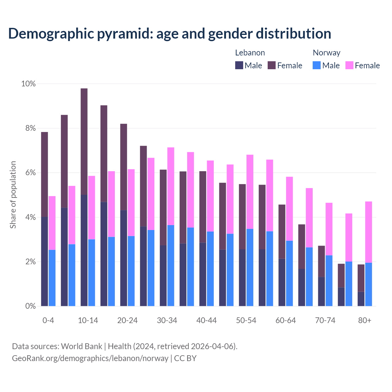 - As of 2026, the population of Lebanon is 5.91M vs 5.67M in Norway.