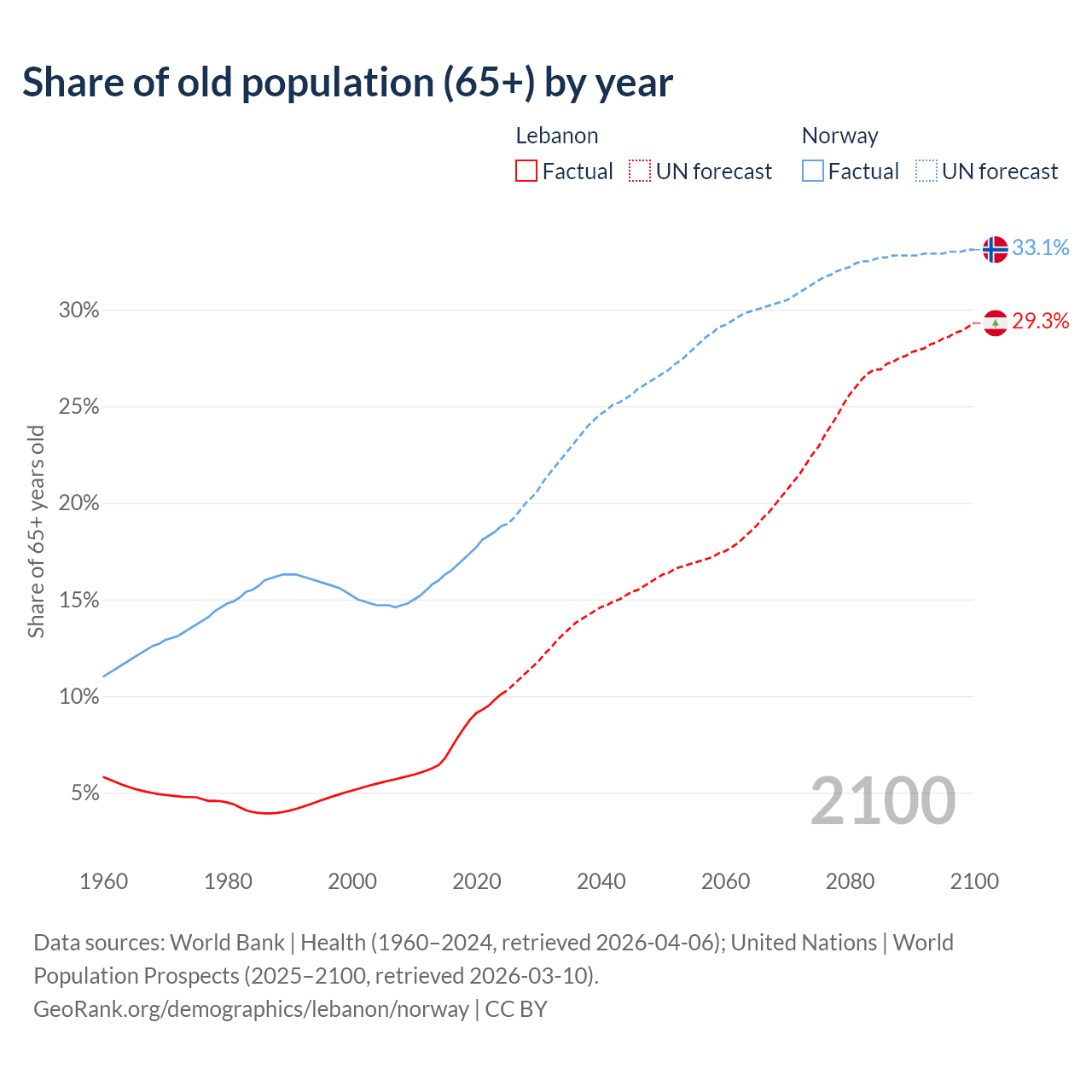 The share of older people aged 65 and over is 10.1% in Lebanon and 18.8% in Norway. Life expectancy in Lebanon compared to Norway .