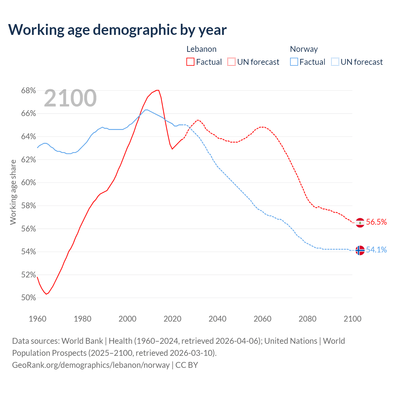 - Lebanon has 3.76M working age adults (aged 15-64) vs 3.69M in Norway.