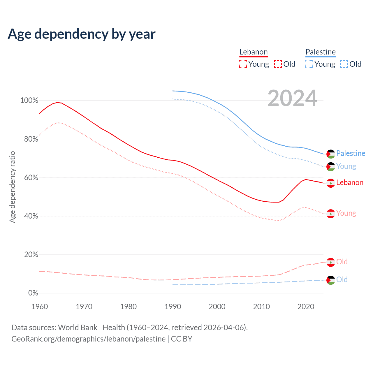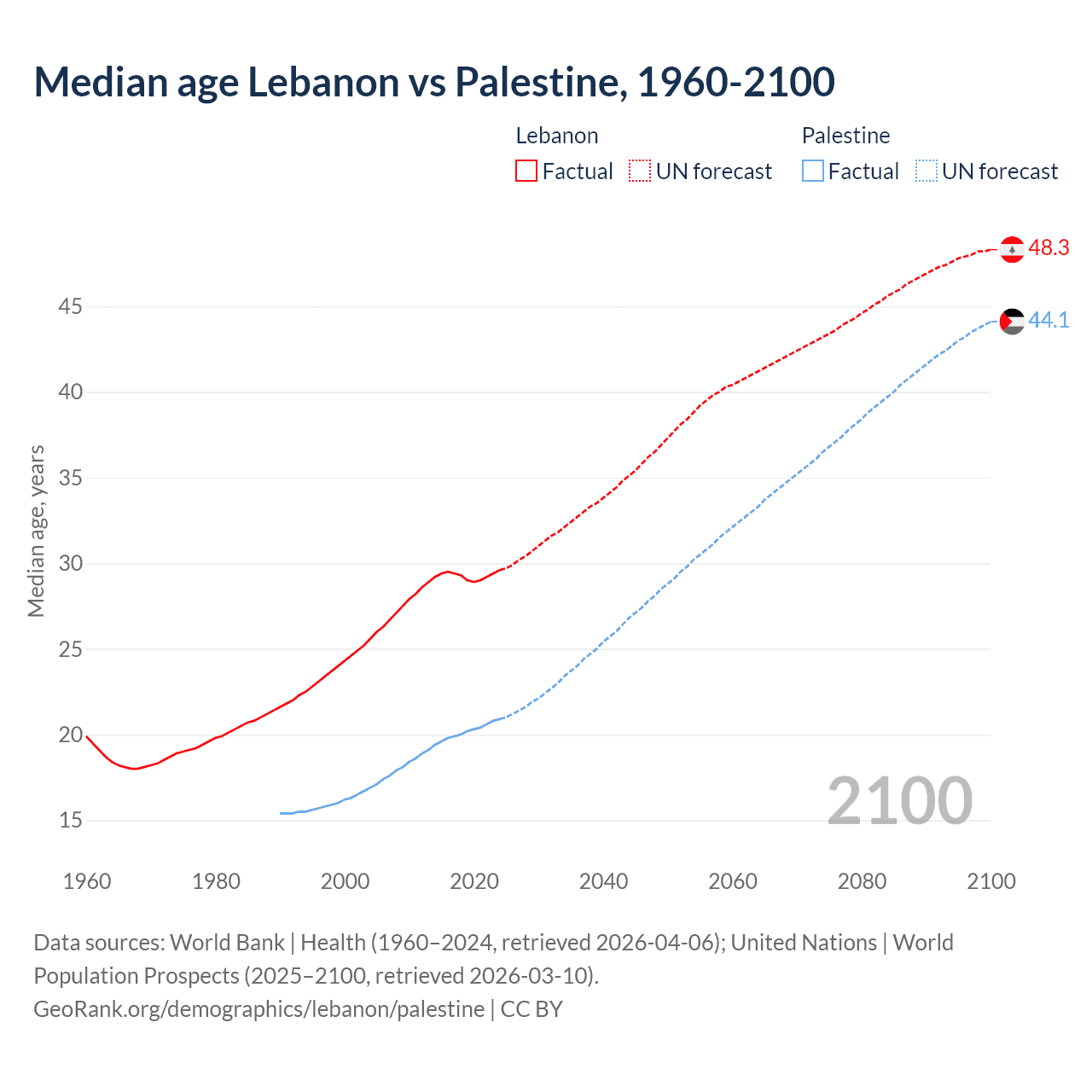 - Lebanon is ranked 106/196 by median age (oldest to youngest) vs 157/196 for Palestine.