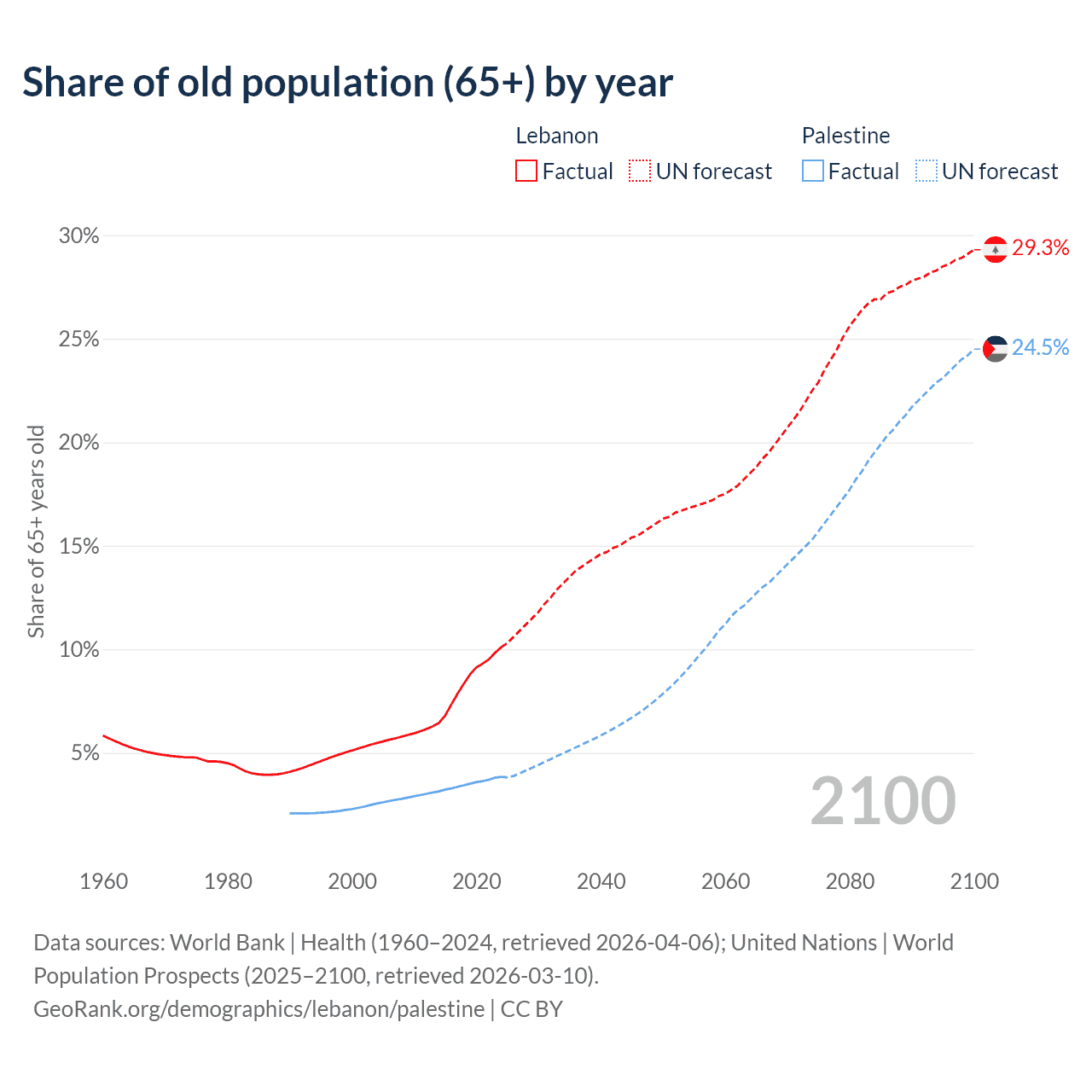 - The share of old-age demographic (65+) in Lebanon is 10.1% vs 3.84% in Palestine.