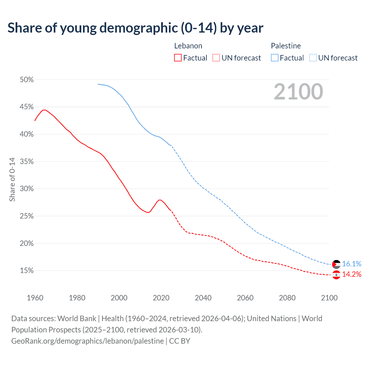 - As of 2026, the population of Lebanon is 5.91M vs 5.5M in Palestine.